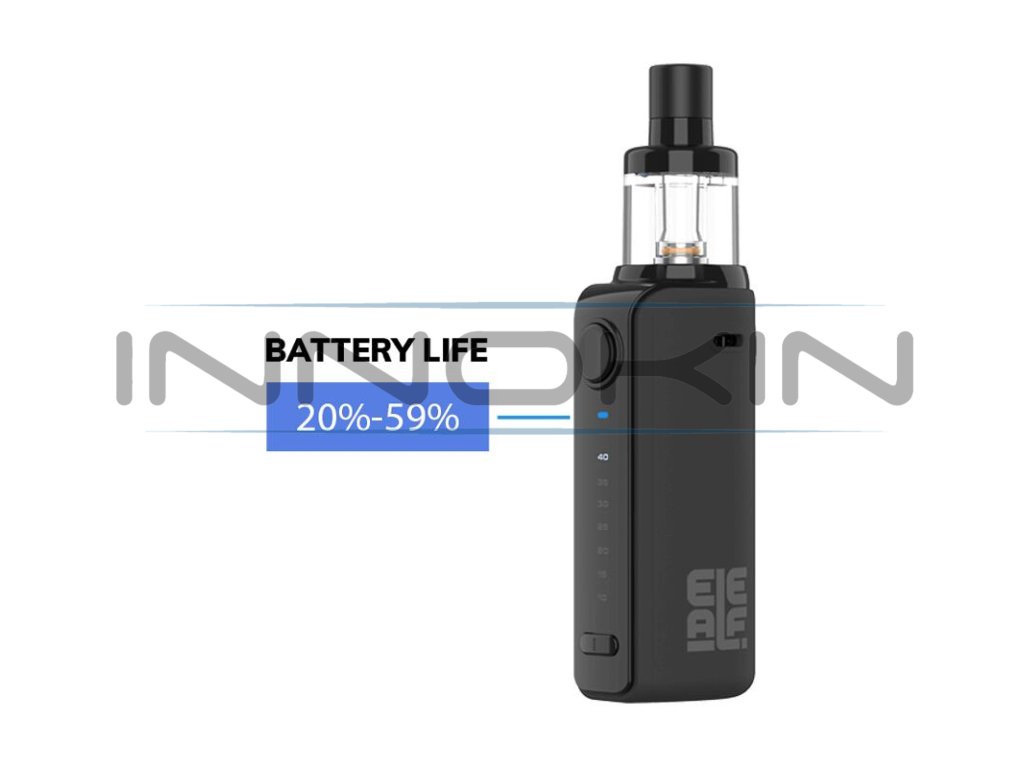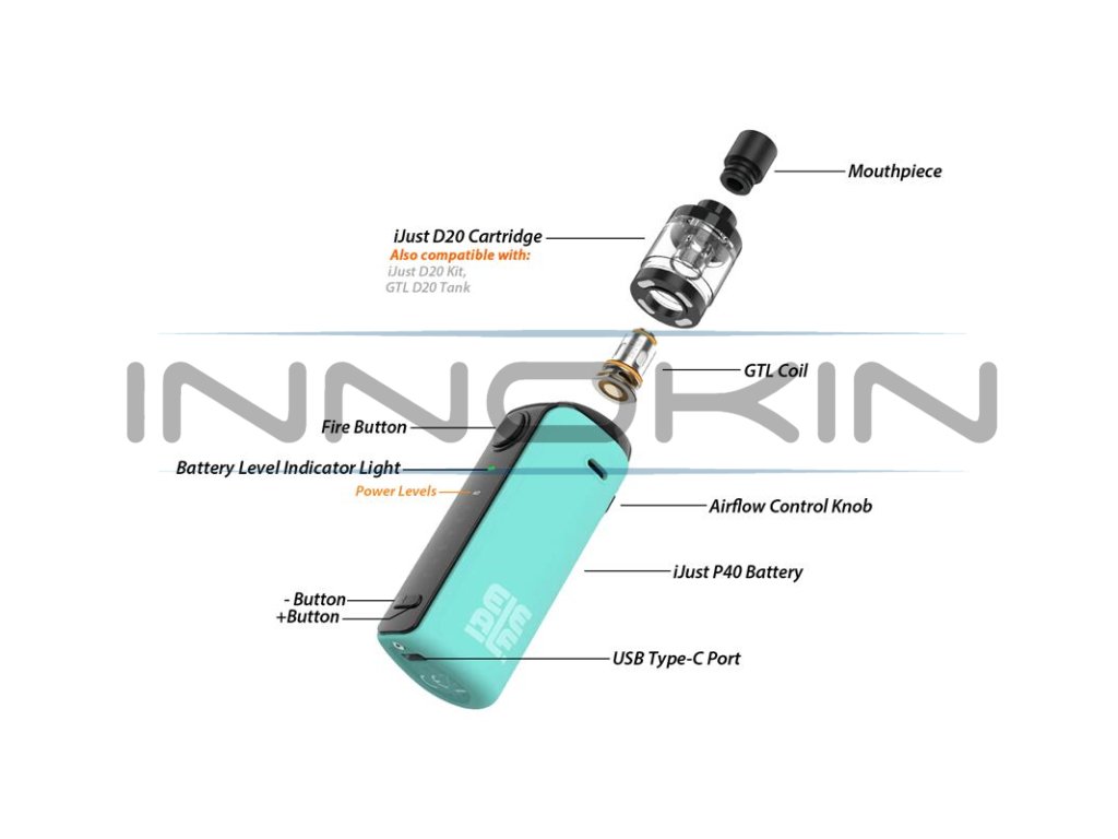 V těle se nachází integrovaná baterie s obrovskou kapacitou 1500 mAh pro dlouhé hodiny nerušeného používání a intenzivní vaping. Díky velké kapacitě baterie si poradí také s dlouhou výdrží u výkonnějšího DL vapingu. V případě potřeby si baterii můžete kdykoliv dobít pomocí rychlého portu USB-C proudem až 2A. Ve vrchní části se nachází cartridge iJust D20 s objemem 3 ml, která je kompatibilní se žhavícími tělísky z platformy Eleaf GTL. V základním balení potom najdete tělísko s odporem 0,4 ohm pro přímé potahování a tělísko 0,8 ohm pro klasické šlukování. Jako bonus najdete na zařízení také pohodlnou manuální regulaci airflow pro nastavení co nejoptimálnější tuhosti potahu. Eleaf iJust P40 Pod Kit je stylová a multifunkční e-cigareta, se kterou se nebudete ani na vteřinu nudit.