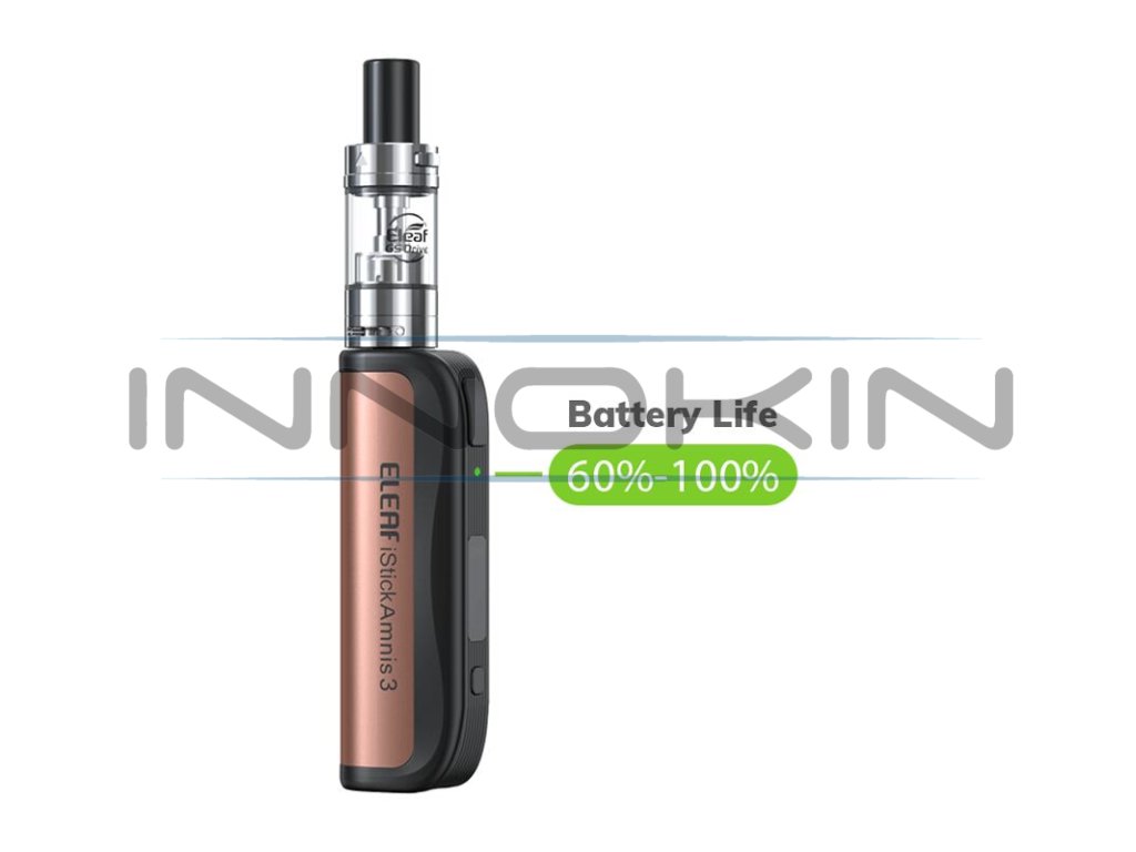 V těle e-cigarety Eleaf iStick Amnis 3 se ukrývá integrovaná baterie se solidní kapacitou 900 mAh pro dlouhé hodiny nerušeného vapování. O aktuálním stavu baterie budete mít neustálý přehled díky praktické LED diodě umístěné pod spínacím tlačítkem. Dioda mění barvu dle aktuálního nabití baterie, při plném nabití svítí zeleně, střední kapacitu signalizuje modrá dioda a téměř vybitý stav potom dioda červená.