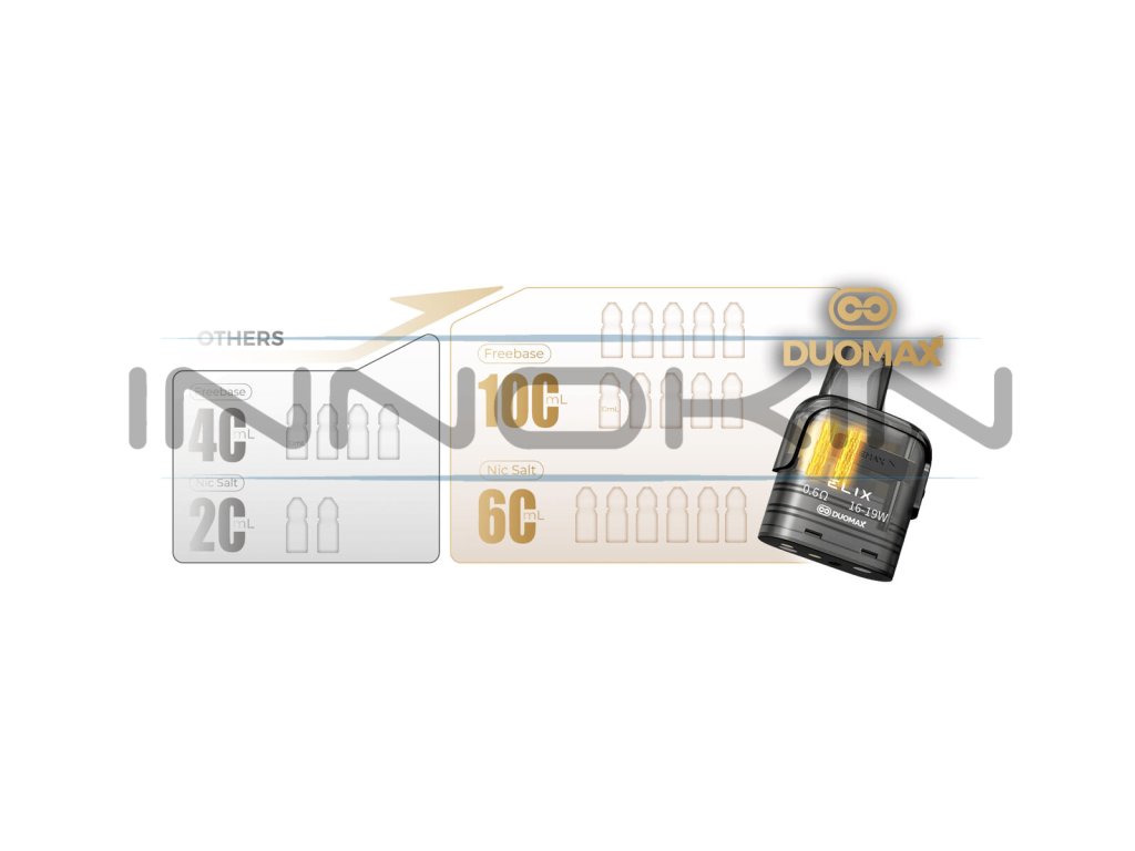 Freemax Elix se představuje s cartridgemi opatřenými novou inovativní technologií Duomax. Cartridge typu Duomax disponují dvěma oddělenými komorami, přičemž v každé se nachází samostatně umístěné mesh pletivo. Díky podpoře duálního mesh pletiva zvládne e-cigareta rychlejší náběh žhavení, plnější a výraznější chuť a delší životnost. Proti konkurenčním běžným cartridgím se jedná až o trojnásobně delší životnost a trojnásobně výraznější chuť.