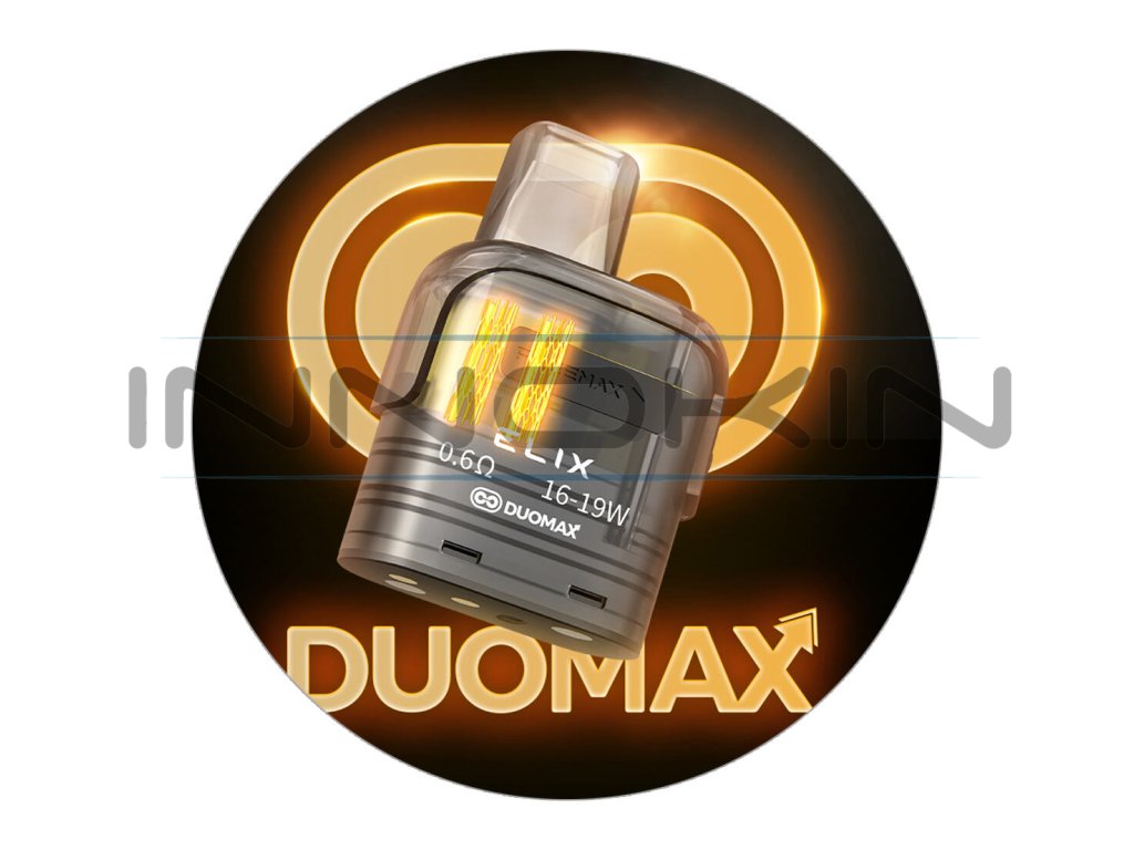 Freemax Elix se představuje s cartridgemi opatřenými novou inovativní technologií Duomax. Cartridge typu Duomax disponují dvěma oddělenými komorami, přičemž v každé se nachází samostatně umístěné mesh pletivo. Díky podpoře duálního mesh pletiva zvládne e-cigareta rychlejší náběh žhavení, plnější a výraznější chuť a delší životnost. Proti konkurenčním běžným cartridgím se jedná až o trojnásobně delší životnost a trojnásobně výraznější chuť.