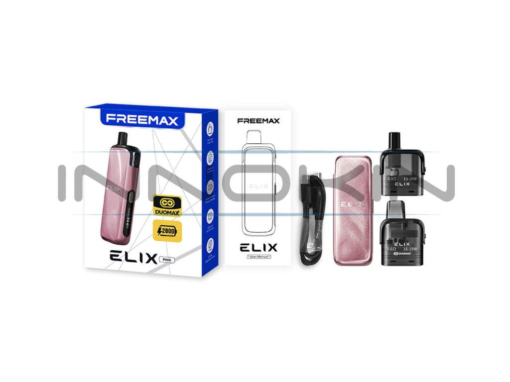 Luxusní Freemax Elix je prémiovým pod systémem s průlomovou technologií Duomax a krásně zpracovanou konstrukcí pyšnící se obrovskou kapacitou baterie. Převratná Duomax technologie se postará o trojnásobné množství chuti a trojnásobnou životnost cartridge proti konkurenčním pod systémům. Díky obrovskému objemu 5 ml a leakproof konstrukci s horním airflow systémem navíc usnadní každodenní používání i proces plnění. Integrovanou baterii s kapacitou 2000 mAh si budete moci užívat po skutečně dlouhou dobu a v případě nutnosti vás jistě potěší rychlé USB-C nabíjení s proudem až 2A. Mezi další výhody patří nastavitelný výstupní výkon až 30W, čitelný OLED displej a kvalitně zpracovaná konstrukce ze zinkové slitiny. Elix je navržen s maximálním citem pro detail, výkon a trvalé dlouhodobé užívání.