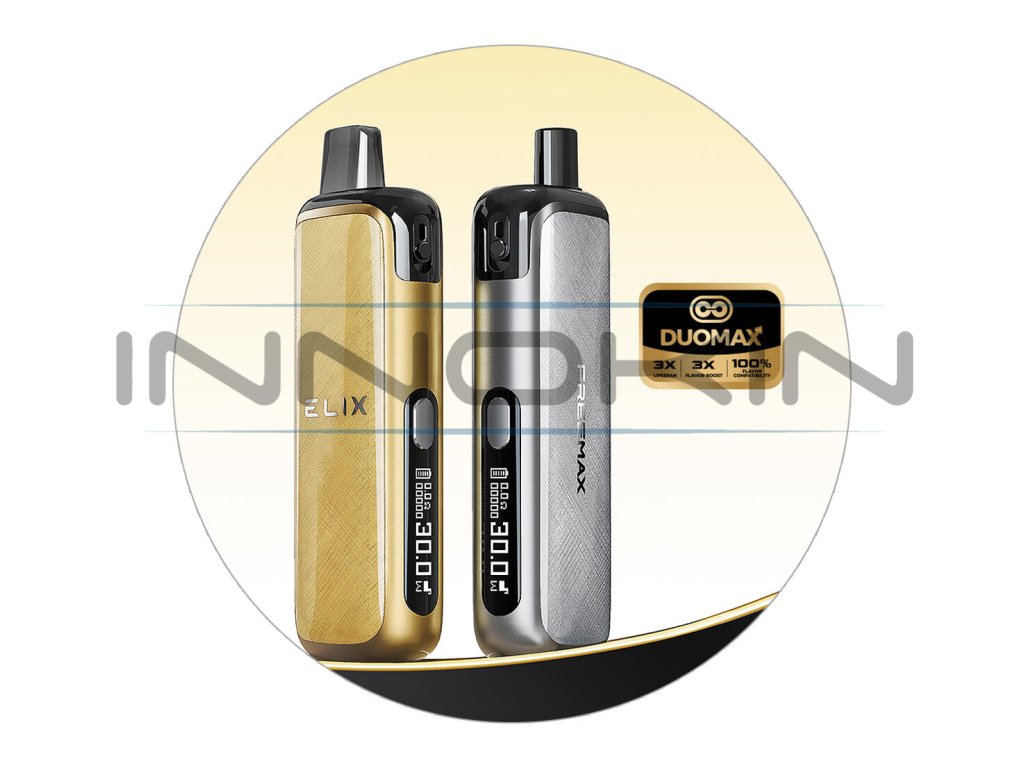 Luxusní Freemax Elix je prémiovým pod systémem s průlomovou technologií Duomax a krásně zpracovanou konstrukcí pyšnící se obrovskou kapacitou baterie. Převratná Duomax technologie se postará o trojnásobné množství chuti a trojnásobnou životnost cartridge proti konkurenčním pod systémům. Díky obrovskému objemu 5 ml a leakproof konstrukci s horním airflow systémem navíc usnadní každodenní používání i proces plnění. Integrovanou baterii s kapacitou 2000 mAh si budete moci užívat po skutečně dlouhou dobu a v případě nutnosti vás jistě potěší rychlé USB-C nabíjení s proudem až 2A. Mezi další výhody patří nastavitelný výstupní výkon až 30W, čitelný OLED displej a kvalitně zpracovaná konstrukce ze zinkové slitiny. Elix je navržen s maximálním citem pro detail, výkon a trvalé dlouhodobé užívání.