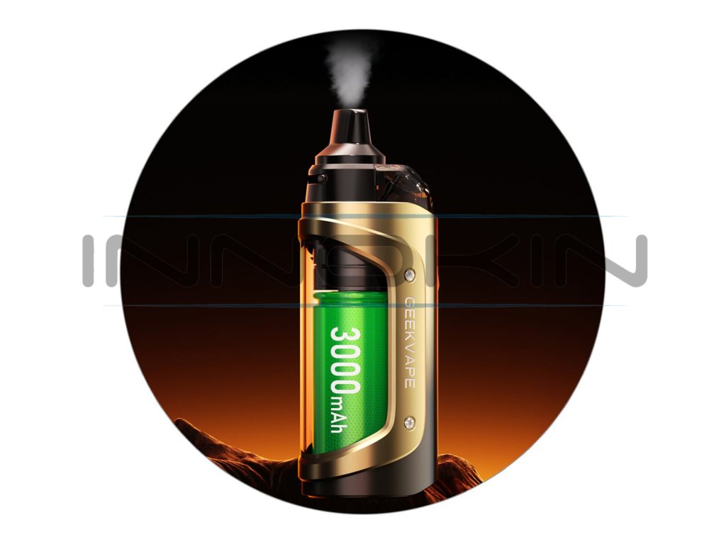 V těle zařízení se nachází napevno nainstalová integrovaná baterie s ohromující kapacitou 3000mAh. Díky této kapacitě se hladce vyrovná také výkonným box modům a přinese dostatečně uspokojivé výsledky také náročným příznivcům přímého potahování do plic. Díky vysokokapacitní integrované baterii si můžete užívat vysoký výkon až do 60W a dlouhé hodiny nerušeného vapování. V případě potřeby můžete baterii dobíjet prostřednictvím portu USB-C proudem až 2A.