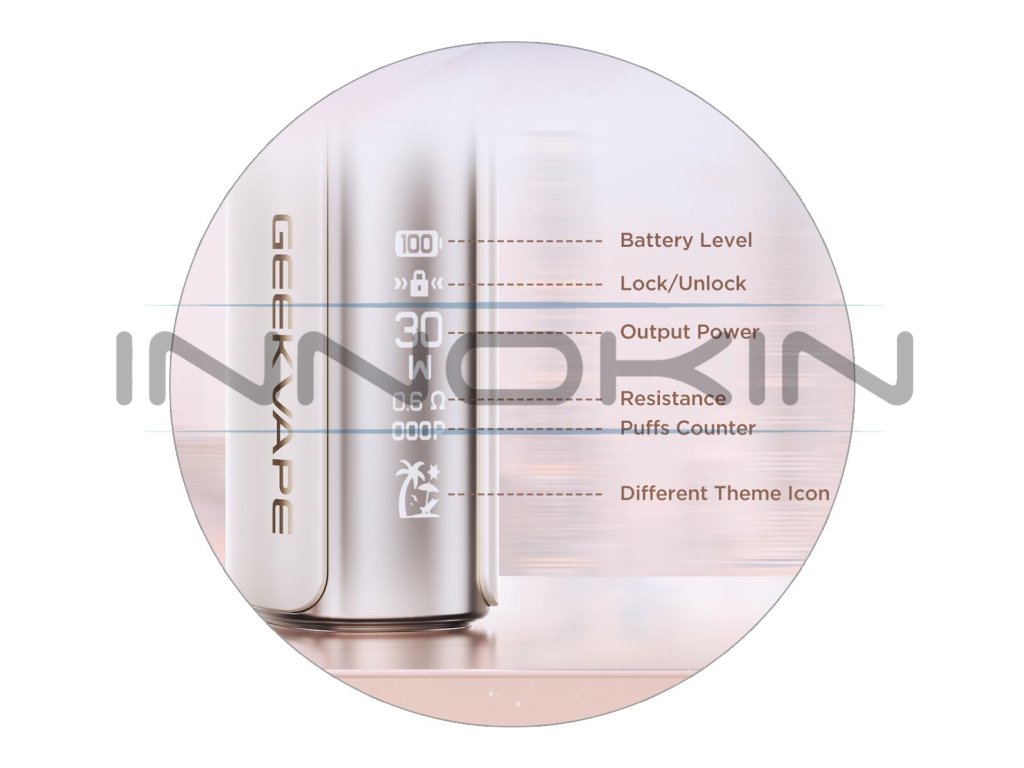 Skrytý displej zapuštěný přímo v těle e-cigarety vám po spuštění odhalí všechny potřebné parametry hezky na jednom místě. Na displeji tak budete mít neustálý přehled o stavu baterie, zámku tlačítka, nastaveném výkonu, naměřeném odporu cartridge a počtu potahů. Ve spodní části displeje si pak můžete uživatelské rozhraní oživit jednou z několika tématických ikon, které najdete v nastavení.