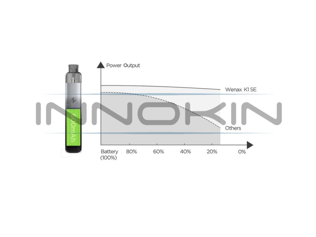 Hlavní výsadou modelu Wenax K1 SE Pod Kit je především nízká hmotnost. Celá e-cigareta nabídne hmotnost pouhých 32 g, díky čemuž se jedná o jedno z nejlehčích zařízení na trhu. Pokud se neradi taháte s těžšími elektronickými gripy a potřebujete mít svou e-cigaretu neustále při sobě, je Wenax K1 SE jasnou volbou, skvěle se hodí jak do společnosti, tak také do zaměstnání, nebo na chvíle turistiky.