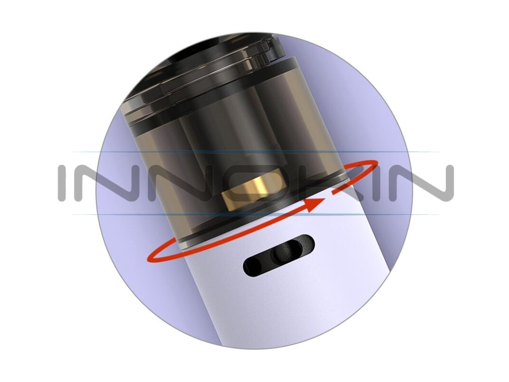 Ve vrchní části se nachází stylová cartridge, do které je nasazeno vyměnitelné žhavící tělísko Innokin S Coil. Odpor tohoto tělíska činí 0,5 ohm. Jedná se o příjemný kompromis pro všechny milovníky MTL potahování. Ve vrchní části cartridge se nachází náustek s uchycením typu 510, který si budete moci snadno nahradit svým vlastním náustkem se stejným typem uchycení.