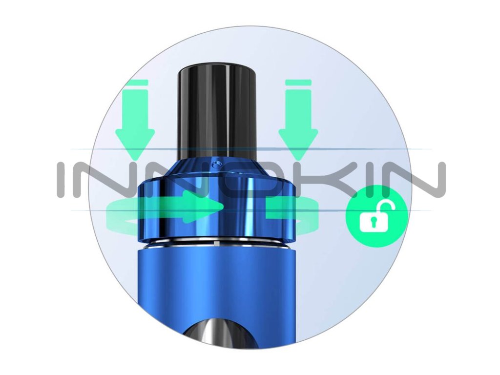 Vrchní uzávěr je opatřen speciální dětskou pojistkou, která zabrání nechtěnému otevření systému pro plnění v případě umístění v cestovním zavazadle, nebo nechtěnému otevření tanku dětmi. Pro zpřístupnění plnícího otvoru je nutné stlačit uzávěr dolů a následně jím otočit, díky této pojistce budete mít váš tank neustále v bezpečí proti případnému úniku e-liquidu.
