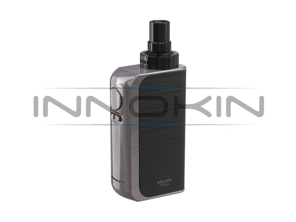 Joyetech eGo AIO ProBox je druhá verze oblíbeného ALL in ONE gripu, který přináší mnohá vylepšení. Již na první pohled je zřetelný jeho nový a moderní vzhled. Tradiční ergonomický tvar těla skrývá vestavěnou baterii o kapacitě 2100mAh. Velkou novinkou je volitelný režim konstantního a přímého napětí (viz detailní popis). Opět se můžeme spolehnout na systém horního plnění - po odšroubování vrchní části, plníte liquid jedním ze dvou otvorů přímo do nádržky o objemu 2ml. Vrchní regulace přívodu vzduchu byla nově umístěna po stranách clearomizeru - převzato od Cubis Pro. eGo AIO ProBox spolupracuje s atomizery řady BF. Clearomizer je podsvícen LED diodami. Při zamčené baterii dlouhým stiskem spínače si můžete vybrat barvu podsvícení clearomizeru (červené, žluté, zelené, modré, indigo, bílé a fialové). Nabíjení umožňuje micro USB vstup (e-cigaretu lze používat i při nabíjení).