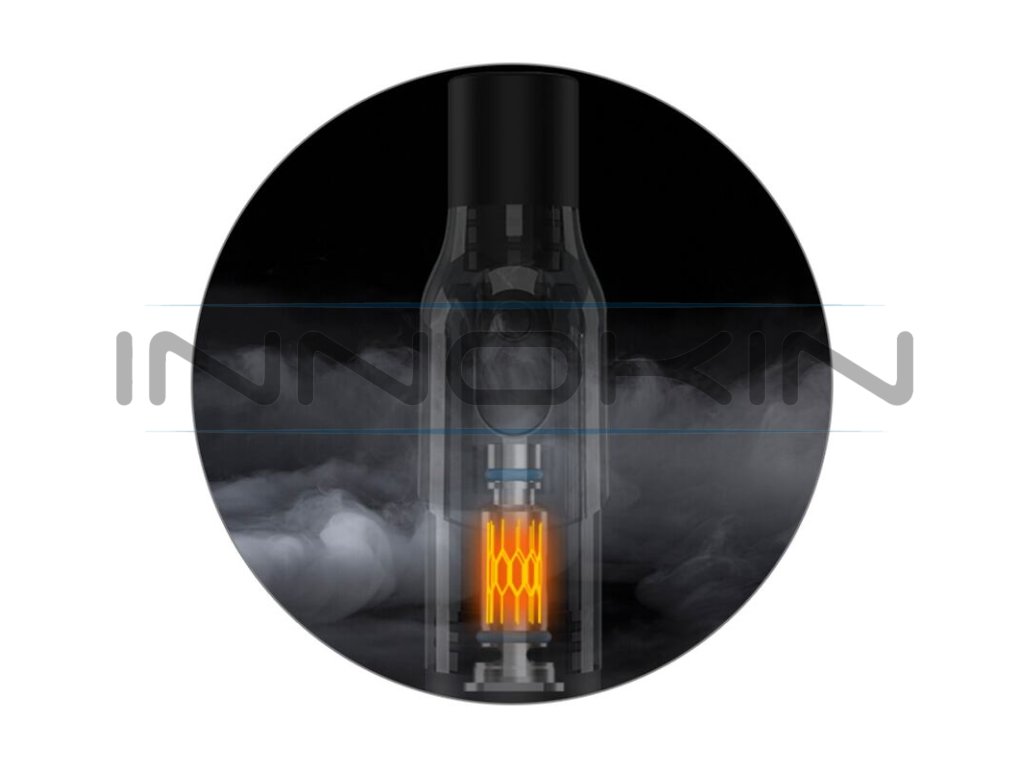 Ve vrchní části se nachází cartridge s ergonomickým tvarem a stylovým náustkem pro komfortní pocit při vapování. Tato cartridge nabídne objem 2 ml a v jejím jádru se nachází integrované žhavící tělísko s mesh pletivem a odporem 1,0 ohm. Nabídne tak rychlý a rovnoměrný náběh žhavení a optimální produkci páry.