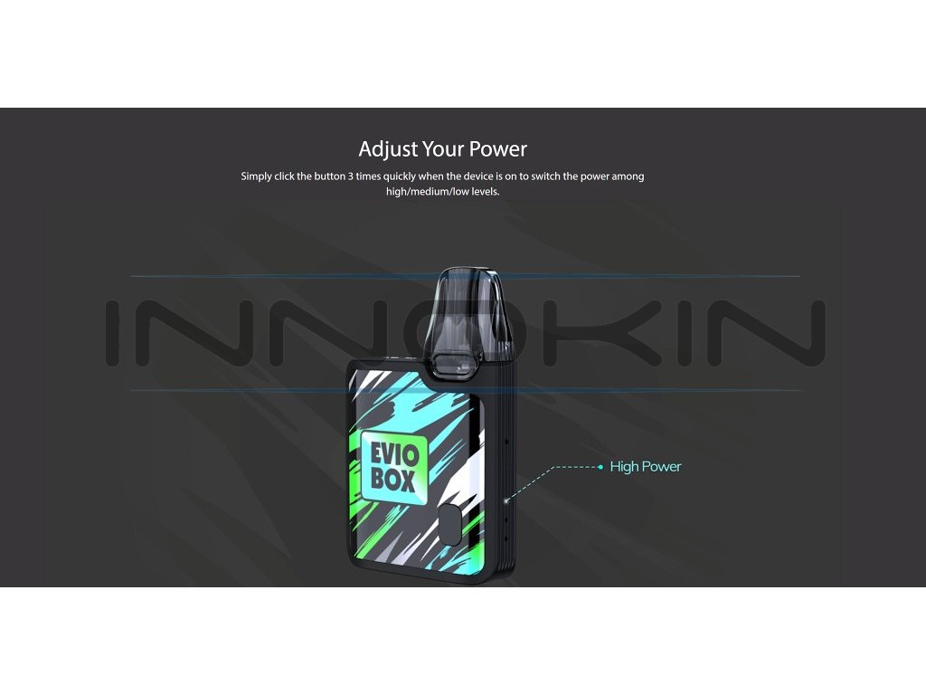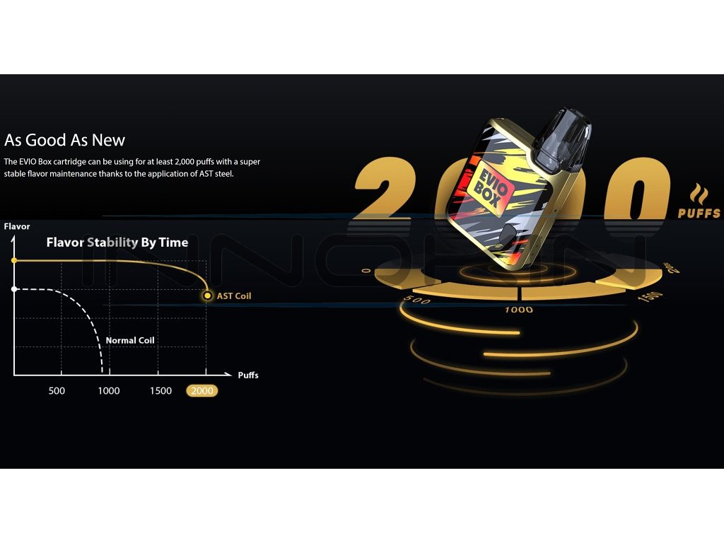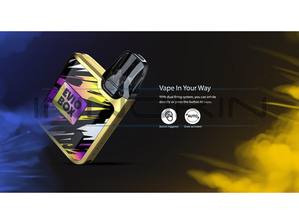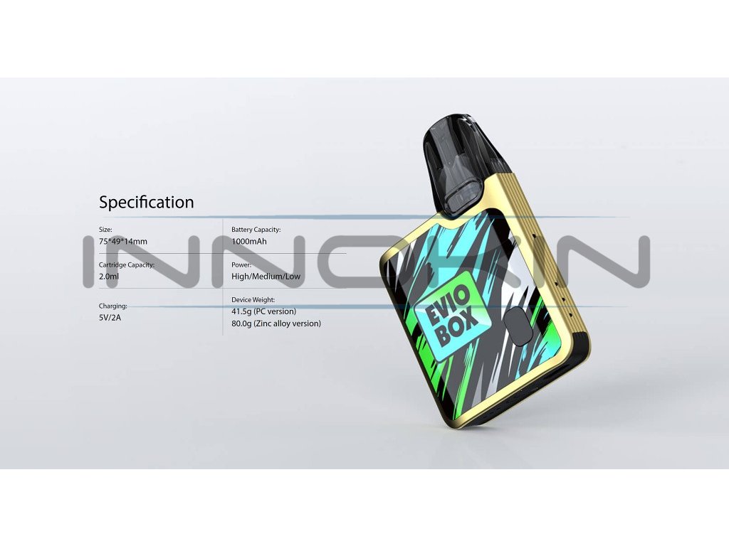 Kompaktní Pod elektronická cigareta, která se vejde pohodlně do kapsy nabízí dostatečný výkon a prvotřídní čip s technologií AST. Joyetech Evio Box nabízí vysokou rychlost žhavení už za 0,001 s, rychlé nabíjení pomocí moderního USB-C konektoru, dvojí způsob spínání potahu, a to jak plně automatický, tak manuální pomocí tlačítka. O samotný výkon s postarají hned tři režimy intenzity žhavení. Kapacita baterie 1000mAh, objem Cartridge 2ml s dvojitým Airflow systémem, rozměry 75 x 49 x 14 mm, 2x žhavící hlava Joyetech EN v SETU. Joyetech EVIO Box je vhodný jak pro klasické MTL šlukování, tak i pro utaženější DL, kdy je pára vdechována přímo do plic. Barevné provedení Gunmetal.