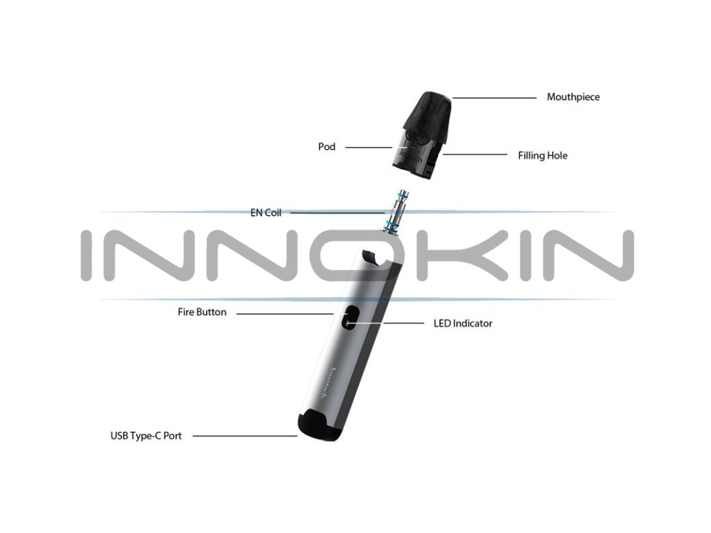 V případě potřeby pak můžete baterii kdykoliv dobít pomocí portu USB-C. Lze dobíjet proudem až 2 A. Přímo ve vrchní části se nachází cartridge s objemem 2 ml a perfektně tvarovaným náustkem pro pohodový vaping. Cartridge je kompatibilní se žhavícími tělísky Joyetech EN Mesh. V balení najdete dvě tělíska s odporem 0,8 ohm. Díky mesh pletivu uvnitř těchto tělísek získáte vynikající podání chuti při každém potahu. Samotnou tuhost potahu potom můžete ovlivnit pomocí duálního airflow systému. Jakmile nasadíte cartridge na tělo baterie jedním ze dvou směrů, ovlivníte tím výslednou tuhost potahu. Jedním směrem je potah vzdušnější, druhým zase utaženější. Volba je čistě na vás. Joyetech EVIO C Pod Kit je synonymem jednoduchosti a praktičnosti.