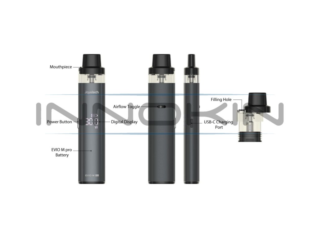 Krásný pod systém Joyetech EVIO M Pro Pod Kit se pyšní elegantně zpracovanou konstrukcí s jedinečným digitálním displejem zapuštěným přímo do konstrukce těla. Díky maximálnímu výstupnímu výkonu 30W s možností regulace si bude skvěle rozumět s rozdílnými odpory cartridgí z platforem EVIO M Pro a EVIO Grip. Pro co nejsnazší používání a pohodlné nastavení uživatelských preferencí je také vybaven praktickým bočním systémem airflow, multifunkčním tlačítkem a výsuvným horním plněním bez nutnosti odpojování cartridge z těla baterie během doplňování. Díky vestavěné baterii s ohromující kapacitou 1100mAh si užijete dlouhé hodiny nerušeného a intenzivního vapování, vše navíc s podporou moderního nabíjení USB-C. Joyetech EVIO M Pro Pod Kit přináší plnohodnotný MTL požitek z vapování a vše potřebné pro každodenní využití.