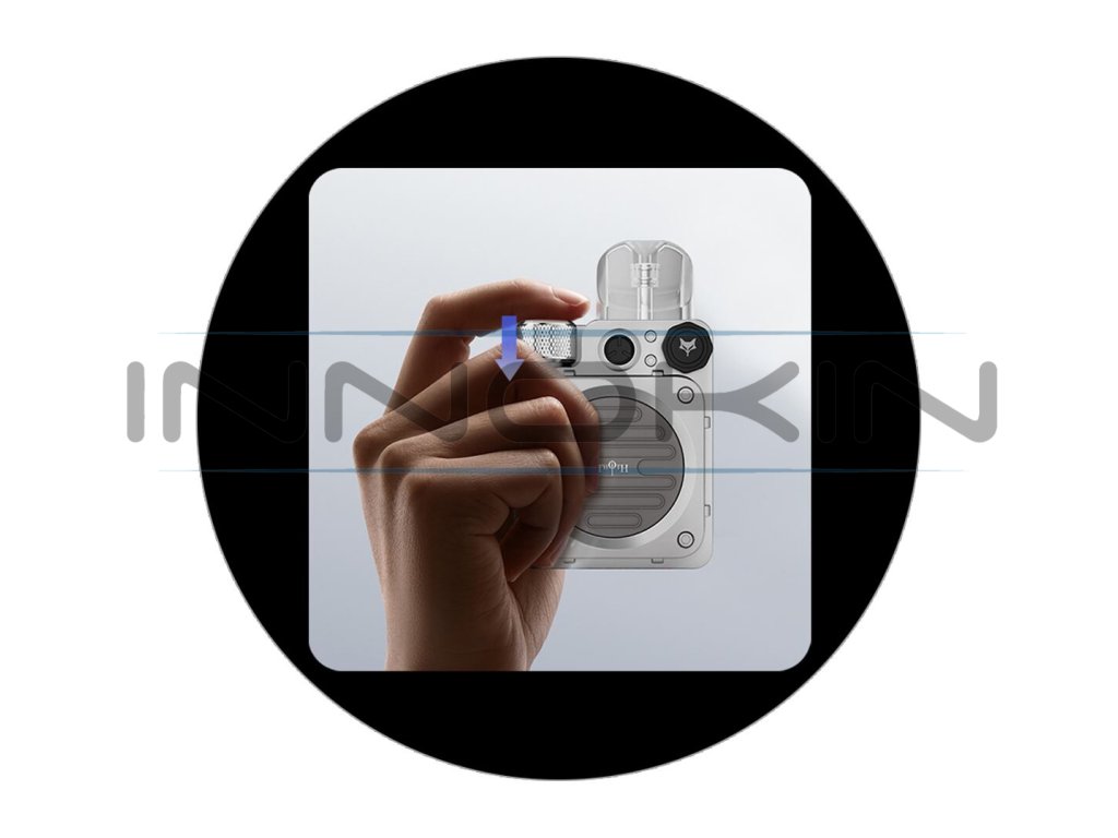 Pro spínání samotného žhavení můžete využít jednu ze dvou dostupných metod. Pokud preferujete konvenční spínání, stačí podržet spínací tlačítko ve vrchní části a začít potahovat. Jestliže však preferujete jednoduchost moderních pod systémů, pro spuštění žhavení vám také postačí jen potáhnout z náustku, žhavení se spustí automaticky bez nutnosti tisknout tlačítko.
