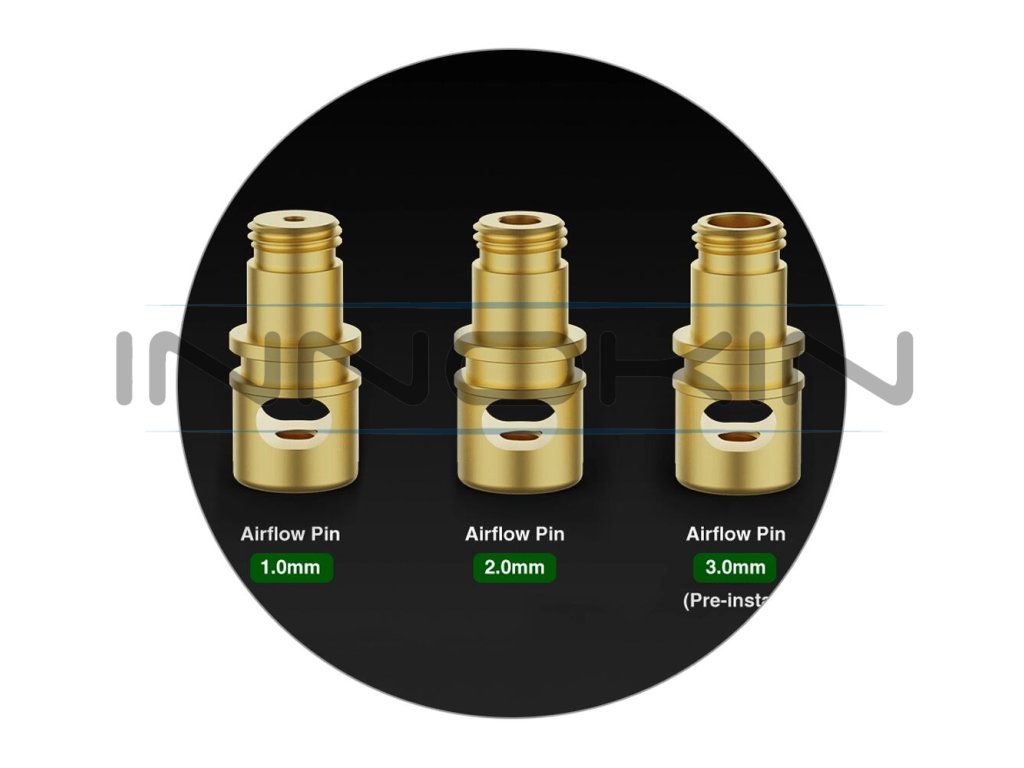 Spodní kontakt boro tanku tvoří pin se vzduchovou vložkou, která ovlivní výslednou tuhost při potahování a jaké množství vzduchu do tanku vstoupí. V balení na vás čekají hned tři piny s průměry 1mm, 2mm a 3mm pro potřeby všech typů vapování.