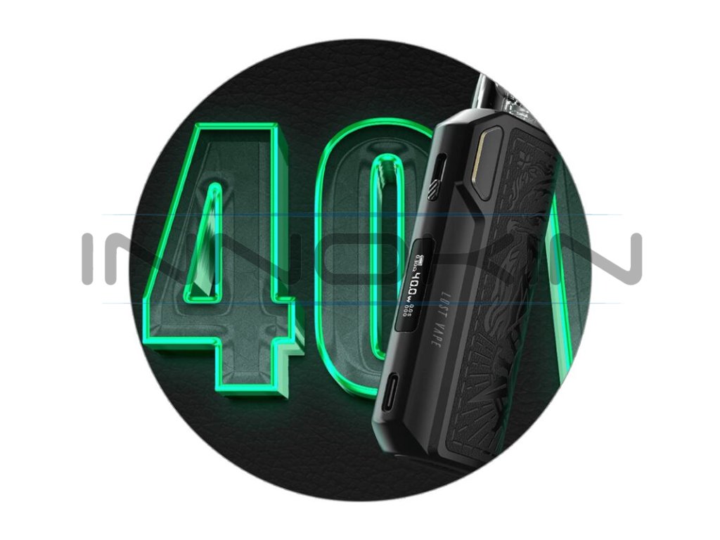 Lost Vape Thelema Elite 40 disponuje elektronickým čipem Quest 2.0, který podporuje ohromný výstupní výkon. Ten se zastavil až na úžasných 40 W. Výkon je plně regulovatelný a snadno si ho přizpůsobíte díky praktickému ovládacímu tlačítku a přehlednému displeji. Díky podpoře vysokého výkonu je e-cigareta vhodná pro všechny typy vaperů, osloví všechny od MTLkařů až po DLkaře.