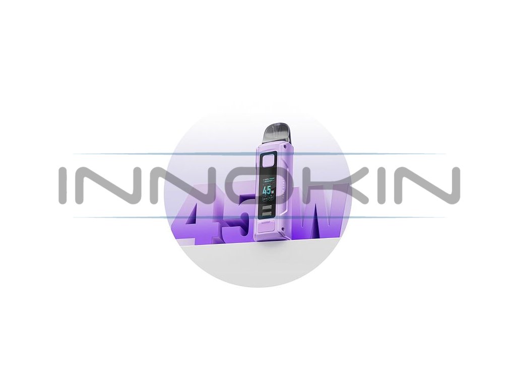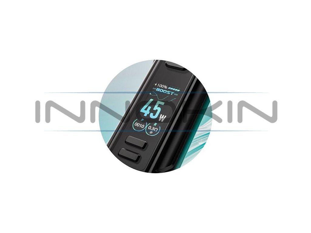 E-cigaretu pohání špičková elektronika umožňující intenzivní vaping s maximálním výkonem až 45 W. Hravě si poradí i se sub-ohmovými Dual Mesh cartridgemi pro tvorbu obrovských hustých mraků. Spolehnout se přitom můžete na inteligentní režim, který automaticky nastaví vhodný výstupní výkon dle odporu připojené cartridge, a zároveň omezí maximální rozsah regulovatelného výkonu, aby nemohlo dojít k jejímu poškození. Pomocí dvou menších tlačítek pod displejem lze výkon jednoduše upravit v daném rozsahu plynule po 1 Wattu.