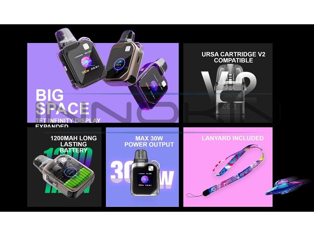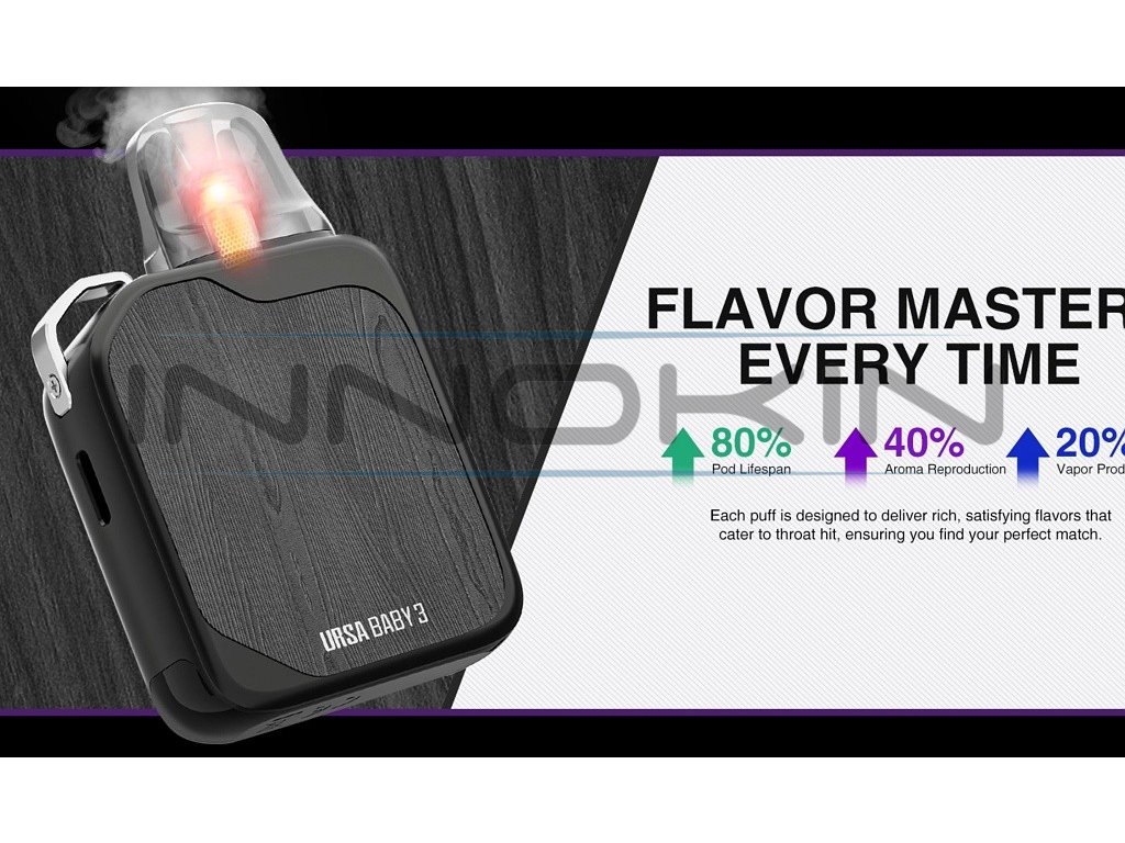 Výhodou třetí generace modelu Ursa Baby je především propracované uživatelské rozhraní s intuitivním ovládáním pomocí jednoho tlačítka. Kombinacemi 1-3-4-5 stisky můžete jednoduše spínat žhavení, přepínat do nastavení výkonu, zamykat tlačítko nebo vypínat celé zařízení podle aktuální potřeby. Čipset Quest 2.0 dokáže spolehlivě pracovat s odpory v rozsahu 0,5 až 2,0 ohmů a poskytuje plynulou regulaci výstupního napětí mezi 3,0 až 4,2 volty. V základním balení naleznete hned dvě cartridge Ursa Pod V2 s odpory 0,6Ω a 0,8Ω, přičemž každá pojme 2ml e-liquidu pro dostatečnou zásobu vaší oblíbené příchutě. Tyto Pod Cartridge druhé generace se pyšní výrazně delší životností než jejich předchůdci a díky pečlivě navrženému mesh pletivu v jádru poskytují prokreslenou chuť s plným profilem. Regulovatelný přívod vzduchu umožňuje přizpůsobit intenzitu potahu vašim preferencím od těsnějšího MTL až po volnější RDL styl. Ergonomické zakřivení těla dokonale padne do dlaně a futuristický design s prémiovým zpracováním zaujme i ty nejnáročnější uživatele elektronických cigaret. K dispozici je široká paleta moderních barevných provedení.