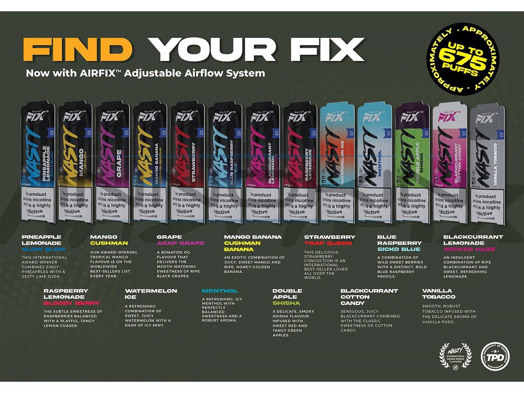 Oblíbená a velmi osvěžující chuť klasického mentolu. Nasty Juice Air Fix je jednorázová elektronická cigareta obsahující 2 ml předplněného e-liquidu uvedené příchutě. Obsahuje nikotinovou sůl, která se rychleji vstřebává do těla a není tak nutné časté potahovaní, jako je tomu klasických liquidů. Cigareta je napájena vestavěnou baterií o kapacitě 700 mAh, se kterou dosáhnete až 675 potažení. Spodní část zařízení disponuje regulací přívodu vzduchu pro optimální nastavení kouřivosti. Jde o ideální řešení pro kuřáky, kteří potřebují jednorázově překlenout pobyt v nekuřáckém prostředí. Obsah nikotinu 10mg/1ml.