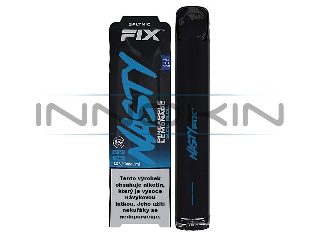Ničím nezaměnitelná chuť exotického ananasu s porcí vychlazené sody, protkané chutí čerstvé limetky. Nasty Juice Air Fix je jednorázová elektronická cigareta obsahující 2 ml předplněného e-liquidu uvedené příchutě. Obsahuje nikotinovou sůl, která se rychleji vstřebává do těla a není tak nutné časté potahovaní, jako je tomu klasických liquidů. Cigareta je napájena vestavěnou baterií o kapacitě 700 mAh, se kterou dosáhnete až 675 potažení. Spodní část zařízení disponuje regulací přívodu vzduchu pro optimální nastavení kouřivosti. Jde o ideální řešení pro kuřáky, kteří potřebují jednorázově překlenout pobyt v nekuřáckém prostředí. Obsah nikotinu 10mg/1ml.