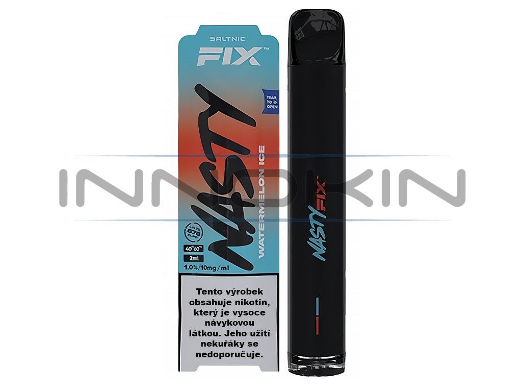 Osvěžující příchuť šťavnatých vyzrálých melounů s ledovým nádechem na konci potažení. Nasty Juice Air Fix je jednorázová elektronická cigareta obsahující 2 ml předplněného e-liquidu uvedené příchutě. Obsahuje nikotinovou sůl, která se rychleji vstřebává do těla a není tak nutné časté potahovaní, jako je tomu klasických liquidů. Cigareta je napájena vestavěnou baterií o kapacitě 700 mAh, se kterou dosáhnete až 675 potažení. Spodní část zařízení disponuje regulací přívodu vzduchu pro optimální nastavení kouřivosti. Jde o ideální řešení pro kuřáky, kteří potřebují jednorázově překlenout pobyt v nekuřáckém prostředí. Obsah nikotinu 10mg/1ml.