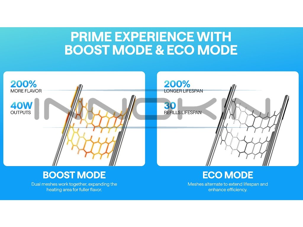 Žhavící hlavy Pod Cartridge obsahuje dvě mesh spirálky z Kanthal materiálu, které se v režimu ECO střídají pro delší životnost. V režimu BOOST žhaví současně pro plnější chuť a větší tvorbu páry, což umožňuje přizpůsobit si styl vapování dle nálady a preferencí uživatele. |
