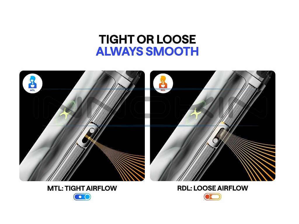 Boční regulace přívodu vzduchu umožňuje snadné nastavení tuhosti potahu praktickou páčkou. Jedním pohybem si můžete přepnout mezi utaženým MTL vapingem a volnějším RDL stylem podle aktuálních preferencí a nálady.