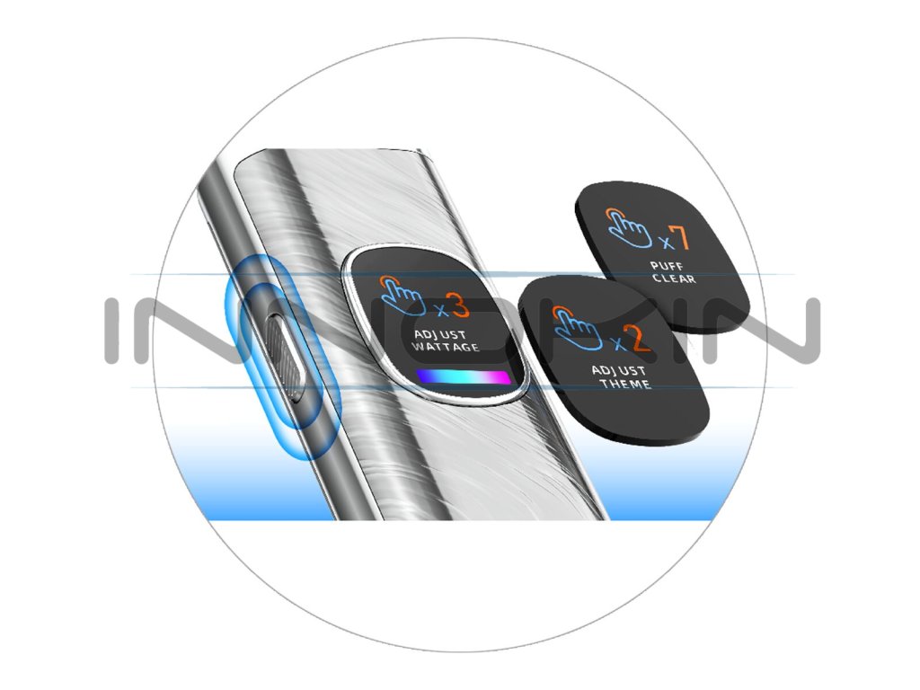 Jedna z bočních částí e-cigarety Xlim Pro 2 disponuje velkým ovládacím tlačítkem, které slouží pro ovládání a nastavení e-cigarety. Pomocí tlačítka si snadno upravíte výstupní výkon, změníte schéma celého zařízení, nebo si můžete vynulovat počítadlo potahů. Tlačítko slouží také pro rychlé zapnutí a vypnutí tradičním stiskem 5x rychle za sebou.