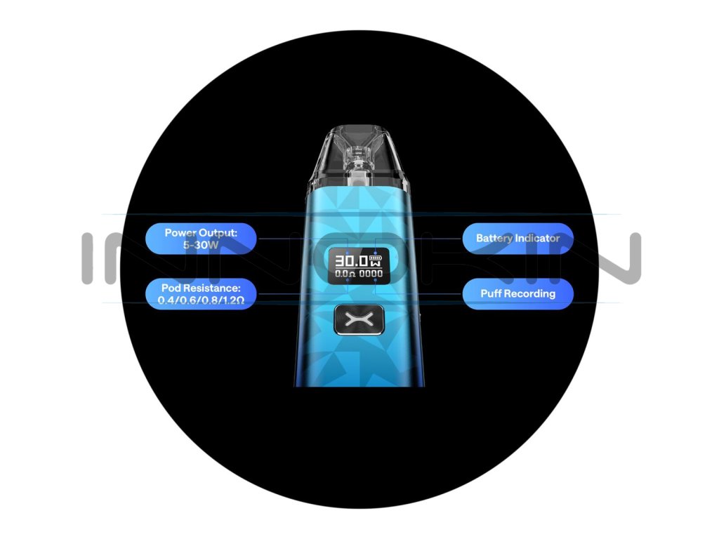 * Zařízení disponuje funkcí inteligentní detekce odporu, po připojení cartridge omezí nastavitelný rozsah výkonu podle odporu připojené cartridge. Výkon 30W lze používat s cartridgí Xlim V3 0.4Ω, která není součástí základního balení.