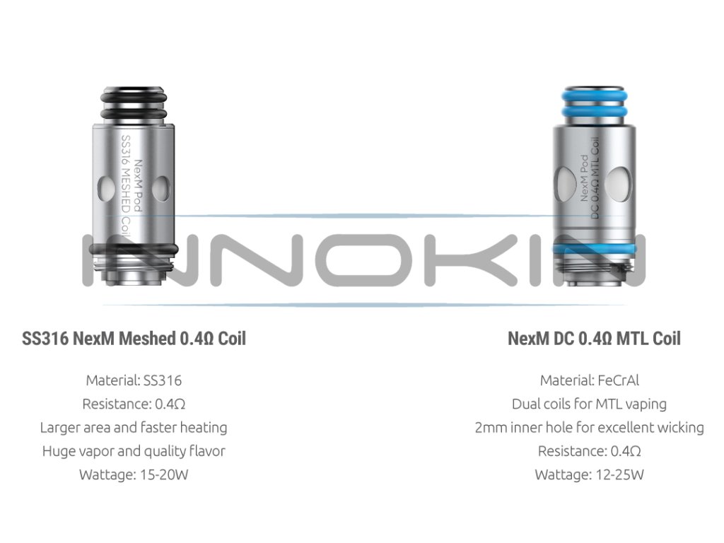 Smoktech nexM pod se může pochlubit dostatečným výkonem až 30W, který jistě pokryje potřeby většiny běžných uživatelů elektronických cigaret. Využití celého výkonu tohoto zařízení umocňuje fakt, že k zařízení byly vyvinuty i zcela nové žhavící hlavy typu Smoktech nexM. V tomto setu naleznete hned dvě, a to žhavící hlavu nexM s mesh technologií o celkovém odporu 0,4Ω, která díky velké odporové ploše a doporučeném výkonu 15-20W produkuje velké množství páry s dokonalým podáním chuti použité náplně. Druhou v pořadí je nexM DC kanthalová spirála s odporem rovněž 0,4Ω, která je určená pro klasické MTL šlukování při doporučeném výkonu 12-25W.