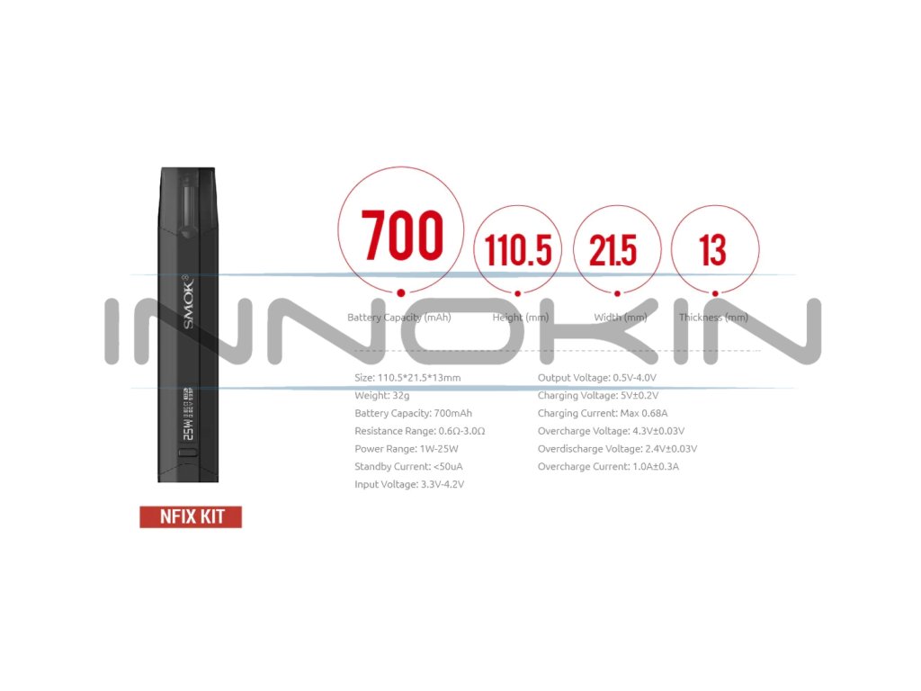 Pro svůj neotřelý design a přidanou hodnotou v podobě OLED displeje se elektronická cigareta Smoktech Nfix řadí mezi další All-in-one zařízení, u kterých se nemusíte vůbec o nic starat. Byla navržena s důsledkem využití každé části a tak není divu, že její váha je pouhých 32g a její rozměry 110,5 x 21,5 x 13mm jsou vskutku kompaktní. Vejde se tak do každé ruky a její pohodlné přenášení například v kapse je samozřejmostí.