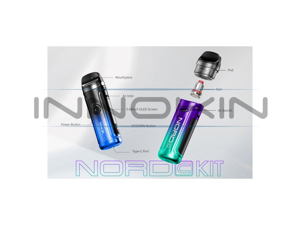 Není určeno pro náplně obsahující nikotin! Smoktech si pro Vás připravil zbrusu nový model elektronické cigarety NORD C, který vás na první pohled zaujme svým futuristickým zpracováním. S tímto ,,parťákem´´ si na cestě vapingu užijete nepřekonatelný DL zážitek za doprovodu té nejlepší chuti liquidu. Kompaktní tělo baterie přináší vestavěný monočlánek o kapacitě 1800mAh, nastavitelný výkon až 50W, inovativní regulaci přívodu vzduchu AFC a rychlé nabíjení pomocí USB-C portu. Na boční straně je umístěn OLED displej, který umožňuje jednoduché nastavení hodnot a zobrazuje všechny potřebné informace. Mezi jeho další přednosti patří ochrana proti zkratu a přehřátí či 8-mi vteřinová ochrana žhavení. Cartridge Nord C o objemu 4,5ml spolupracuje se žhavícími hlavami RPM2.