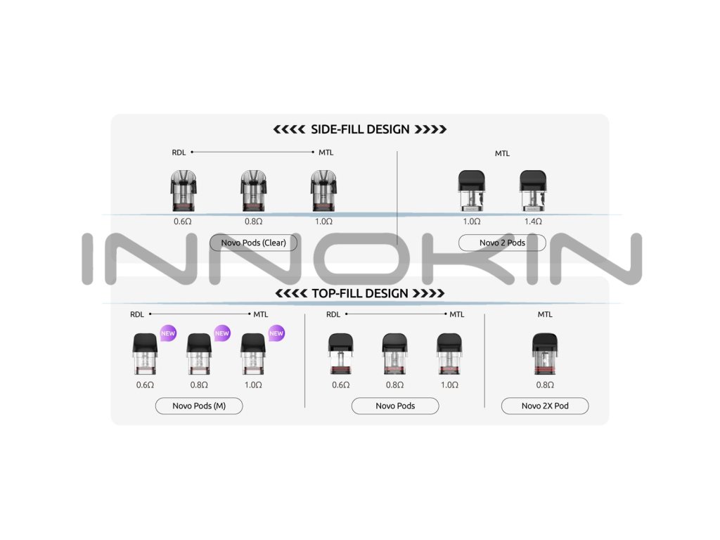 Současně přichází na trh i nová řada podů NOVO M a NOVO SLR, které doplňují stále rostoucí platformu NOVO cartridgí. Díky tomu můžete vybírat ze široké nabídky různorodých typů, které jsou zpětně vzájemně kompatibilní a nabízí různé způsoby plnění, tradiční spirálku i mesh pletivo. Verze „M“ má vylepšený tvar náustku a inovovanou nabídku odporů. „SLR“ se může pochlubit inovativním plnícím otvorem s uzavírací membránovou pružinkou.