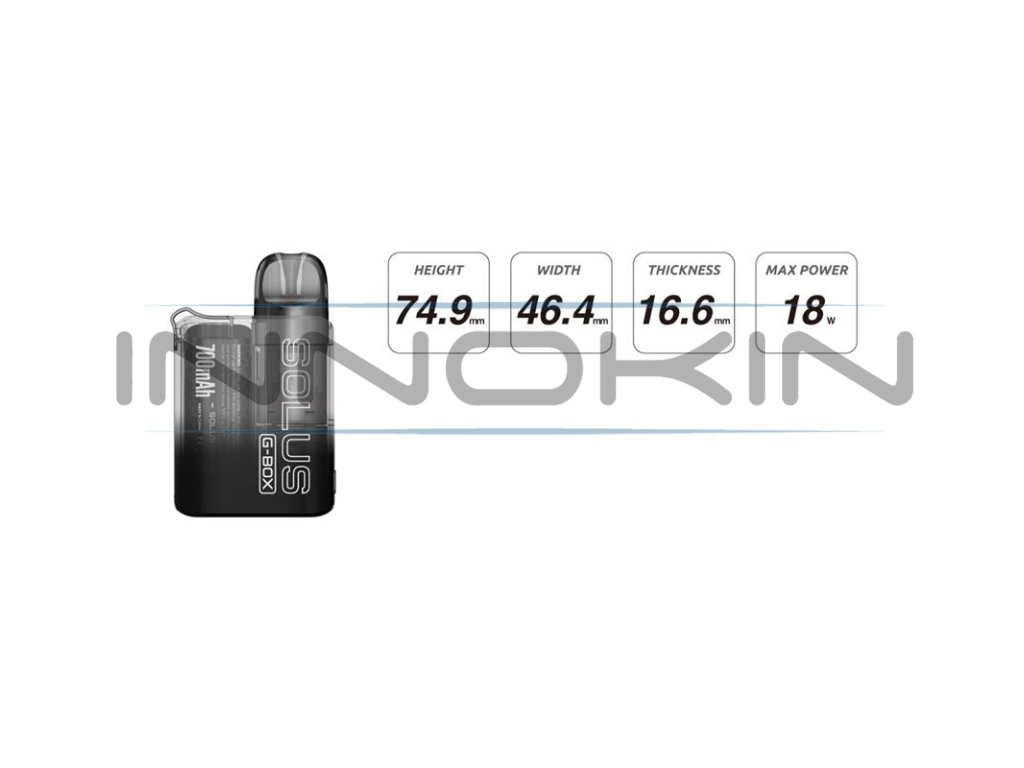 V těle modelu Solus G-Box se nachází integrovaná baterie se solidní kapacitou 700 mAh pro mnohahodinový nerušený provoz, stabilní chod a výkon a pro bezproblémovou funkčnost. Baterie je vybavena také řadou bezpečnostních ochran pro pohodový a bezpečný vaping. Nesmí chybět ani podpora moderního USB-C nabíjení, zařízení podporuje nabíjení proudem až do 0.77A.
