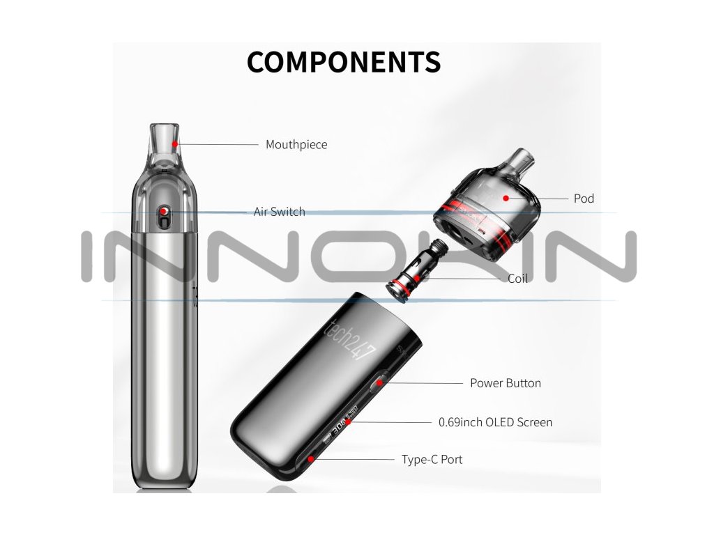 Elektronická cigareta s POD systémem Tech247 Vás na první pohled zaujme dokonalým ergonomickým tvarem baterie s nadupaným vestavěným monočlánkem o kapacitě 1800mAh, který aktivujete spínacím tlačítkem nebo pouhým potahem z cartridge. Tech247 dále disponuje moderním IQ čipem, který za Vás nastaví ideální výkon dle stavu nabití baterie a odporu žhavicí hlavy nebo aktivuje ochranu proti přehřátí a podbití, či 8-mi vteřinovou ochranu žhavení. Na boční straně baterie najdete přehledný OLED displej se všemi potřebnými informacemi o nastavení, včetně možnosti nastavení výkonu od 5W do 30W. Cartridge Tech247 nabízejí 4ml objem a postranní airflow, který je regulován pomocí speciální páčky. Tento model je vybaven novými žhavicími hlavami M-Coil Meshed o odporu 0,6ohm a 0,8ohm.