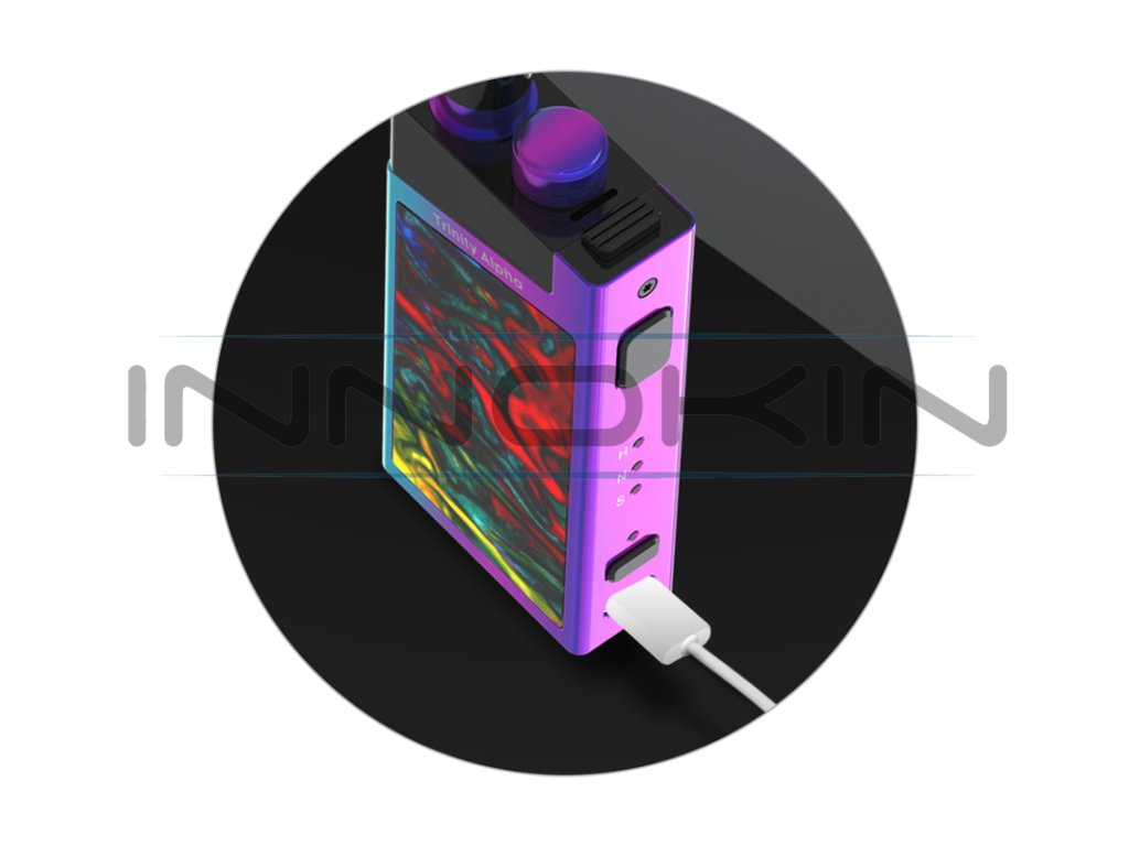 V těle e-cigarety Trinity Alpha se ukrývá integrovaná baterie s kapacitou 1000 mAh. Tato baterie si bez problému poradí s několikahodinovým provozem bez nutnosti dobití. Pokud však přeci jen dojde na dobíjení, potěší vás přítomnost spodního USB portu pro připojení kabelu a rychlé dobití baterie proudem až 1 A. Baterii tak dobijete velice rychle například pomocí adaptéru do sítě.