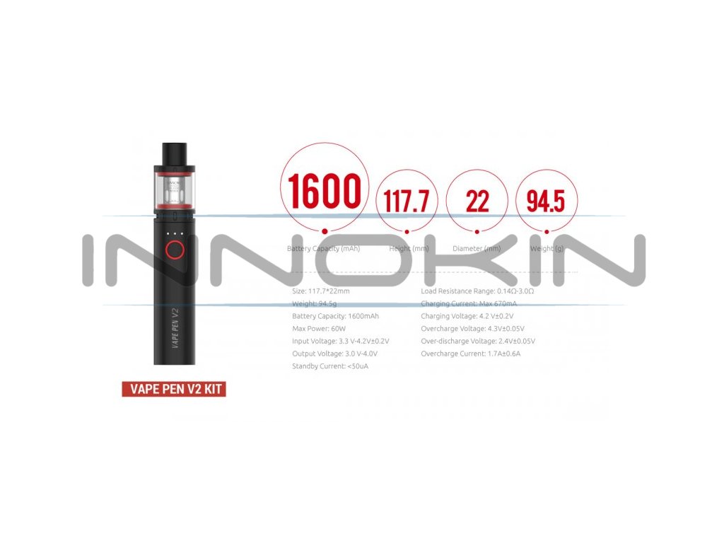 Není určeno pro náplně obsahující nikotin! Elektronické cigarety Vape Pen od Smoktechu přicházejí s verzí V2, kterou si oblíbí jak zkušení uživatelé, tak i úplní začátečníci, a to díky jednoduché obsluze s automatickým výkonem až 60W (výkon je nastavován automaticky v závislosti na zvoleném odporu atomizeru). Ergonomické tělo baterie disponuje kapacitou 1600mAh, LED indikátorem stavu nabití a důmyslným vyváženým přívodem vzduchu pro dokonalou chuť liquidu a optimální kouřivost. Baterie je opatřena speciálním závitem pro clearomizer, který lze jednoduše odšroubovat a vyměnit žhavicí hlavu řady Vape Pen. Používá systém horního plnění - po odšroubování vrchní části plníte liquid přímo do těla nádržky o objemu 3ml. Boční přívod vzduchu zajišťuje velkou tvorbu páry. Mezi její další přednosti patří ochrana proti zkratu a přehřátí, nízkému odporu a 8-mi vteřinová ochrana žhavení.
