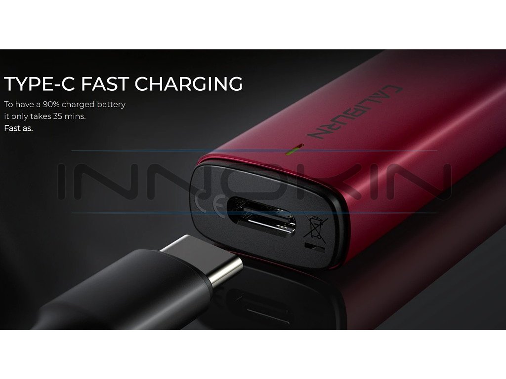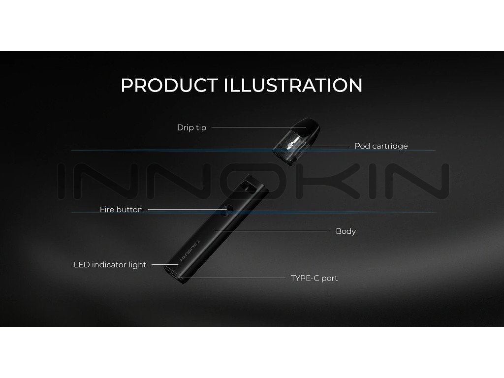 Pod elektronická cigareta vhodná pro MTL styl vapování s celkovým výkonem 15W, cartridge s objemem 2ml a Mesh žhavící hlavou s technologii kvality chuti Pro-FOCS s celkovým odporem 0,9ohm, vestavná baterie s kapacitou 520mAh, USB-C nabíjení, tělo z hliníkové slitiny, rozměry 110 x 21,3 x 11,7 mm. Možnost automatické i manuální aktivace potahu. Opakovaně plnitelná Pod Cartridge Caliburn A2.