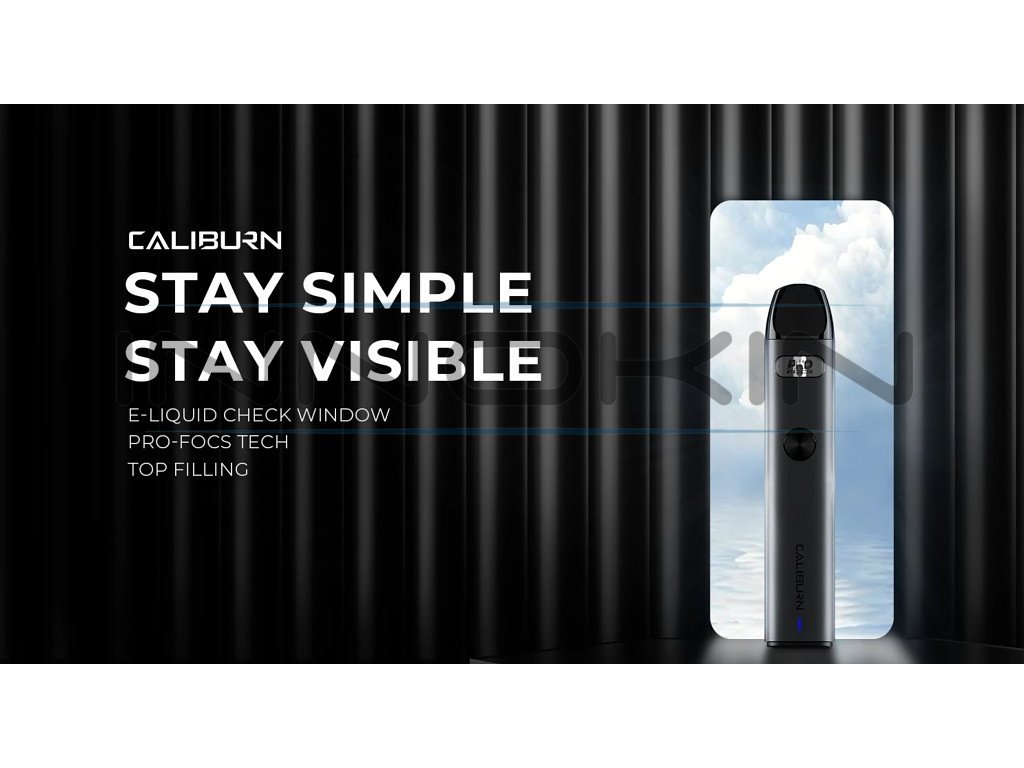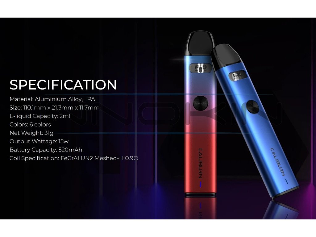 Pod elektronická cigareta vhodná pro MTL styl vapování s celkovým výkonem 15W, cartridge s objemem 2ml a Mesh žhavící hlavou s technologii kvality chuti Pro-FOCS s celkovým odporem 0,9ohm, vestavná baterie s kapacitou 520mAh, USB-C nabíjení, tělo z hliníkové slitiny, rozměry 110 x 21,3 x 11,7 mm. Možnost automatické i manuální aktivace potahu. Opakovaně plnitelná Pod Cartridge Caliburn A2.