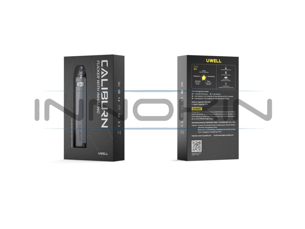 Uwell Caliburn A2S Pod Kit je novým přírůstkem do bohatého portfolia praktických MTL pod systémů Caliburn. Designově doplňuje sérii Caliburn A a jedná se zároveň o zjednodušenou verzi populárního modelu Caliburn A2 Pod pro ještě snazší využití. Uwell Caliburn A2S nabídne kompaktní rozměry, krásné designové zpracování, nízkou hmotnost a kompletně beztlačítkový provoz. U těla lze naměřit rozměry 110,1 x 21,3 x 11,7 mm, tradiční designové zpracování potom příjemně kopíruje tvar dlaně a perfektně se drží. Váha celé e-cigarety činí krásných 30 g, v ruce ji proto téměř ani neucítíte a navíc si ji budete moci vzít kamkoliv pohodlně s sebou. Tělo je vyrobeno z kvalitní hliníkové slitiny, kterou doplňuje cartridge z odolného PCTG. Uvnitř těla na vás potom čeká integrovaná baterie s kapacitou 520 mAh pro dlouhé hodiny nerušeného potahování. Pro dobíjení potom poslouží konektor USB-C ve spodní části.