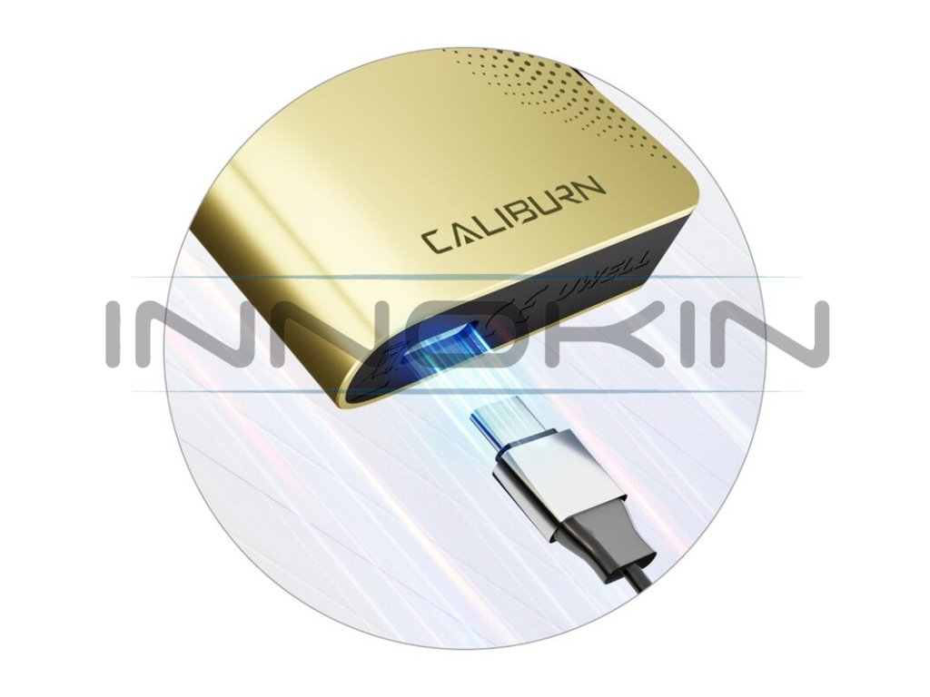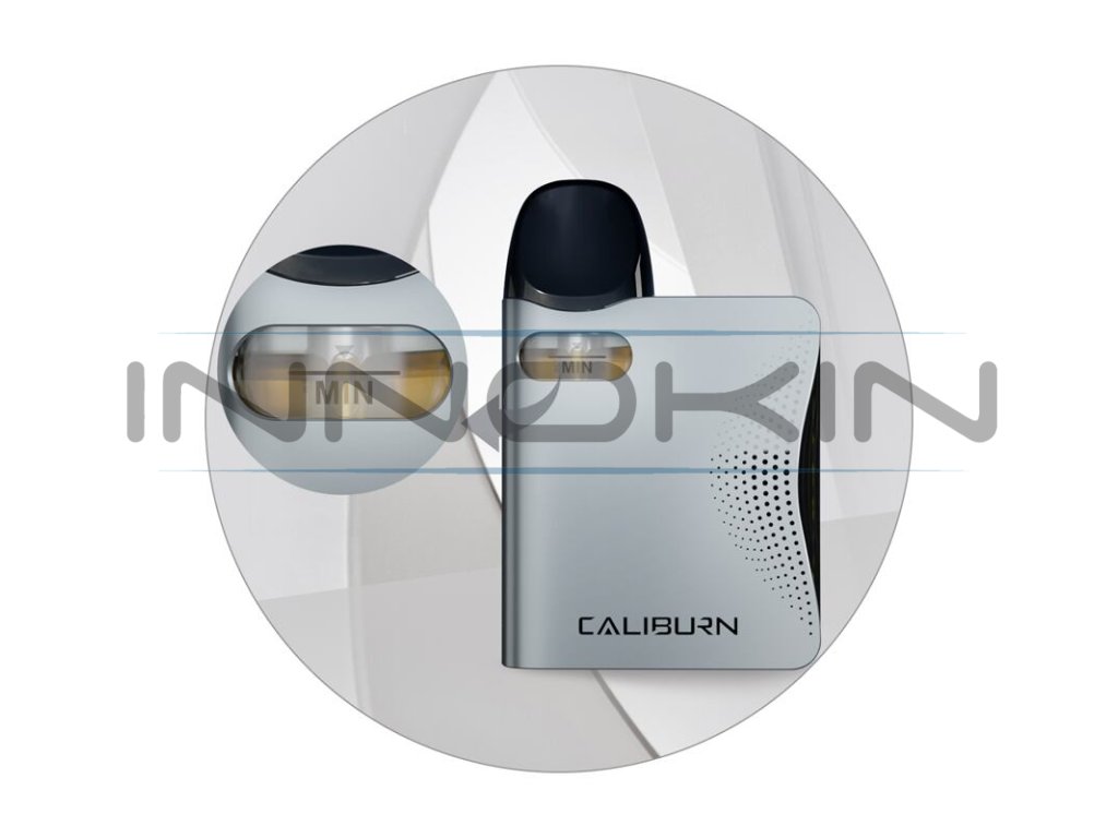 V boční části se nachází unikátní LED indikace, která slouží pro snadné zjištění stavu baterie. Podsvícené logo CALIBURN v boční části je navíc vybaveno stylovou animací, která se spustí po ukončení potahu. Logo začne měnit svou barvu a dodá celé e-cigaretě futuristické vzezření. Funkci animace bočního panelu si navíc můžete v případě potřeby kdykoliv deaktivovat, postačí jen třikrát odpojit cartridge od těla.