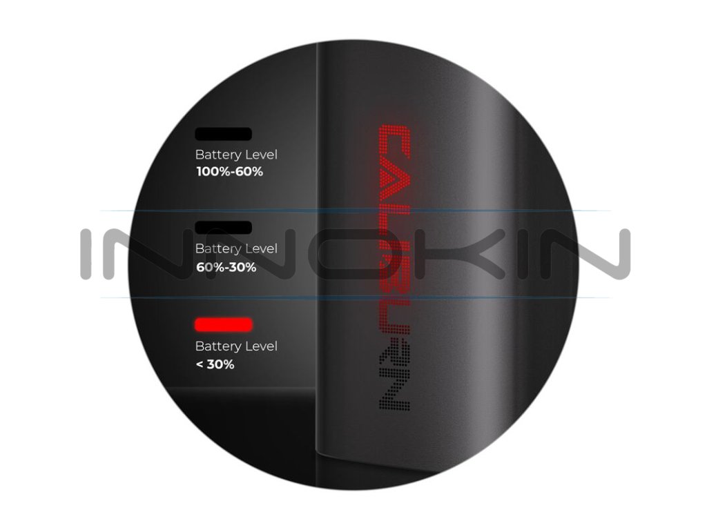 V přední části modelu se nachází tradiční logo série Caliburn, které slouží také jako indikační dioda. Logo je podsvícené barevnou LED diodou, která mění barvu dle aktuálního stavu baterie. Indikace nabídne celkem tři barvy pro snadné a rychlé zjištění přibližného stavu baterie. Indikace je krásně čitelná i na slunci a o své baterii tak budete mít neustálý přehled.