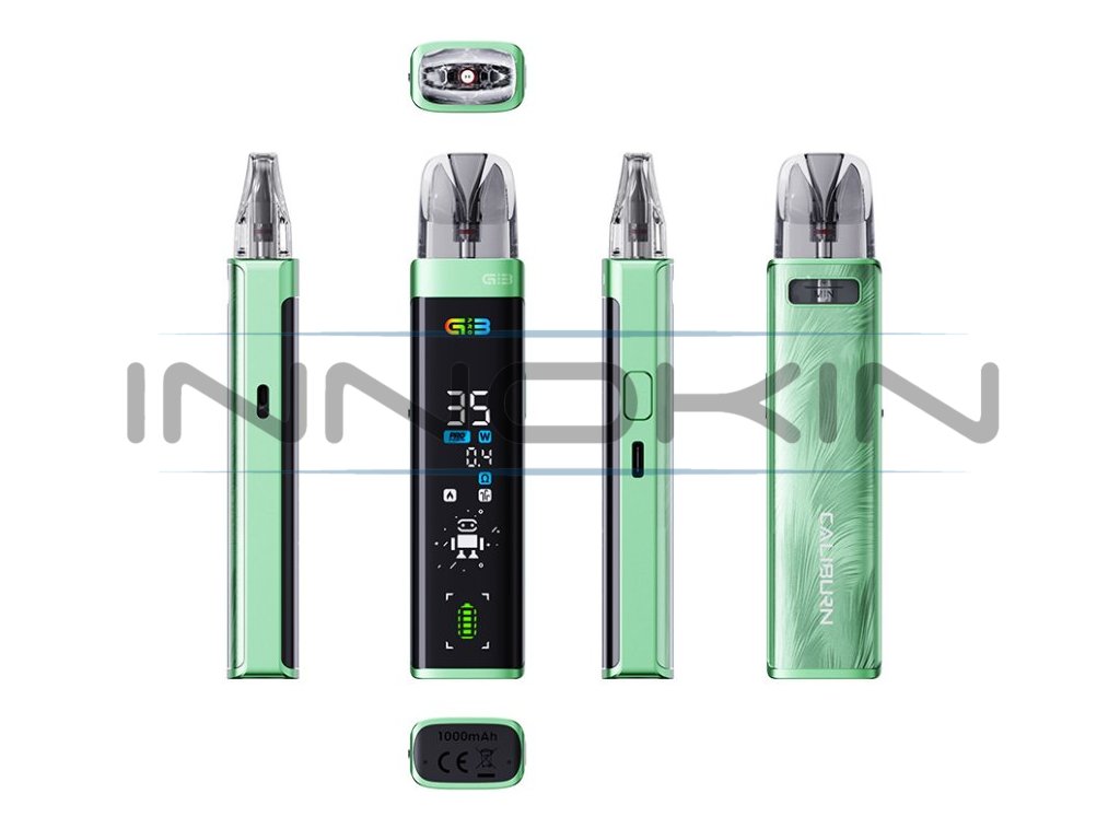 Není určeno pro náplně obsahující nikotin! Uwell Caliburn G3 PRO se pyšní velkým barevným LCD displejem, který je umístěn po celé přední straně baterie = zobrazení všech detailů Vašeho vapingu na první pohled. Integrovaný monočlánek disponuje kapacitou 1000mAh, nastavitelným výkonem až 35W a USB-C portem pro rychlé nabití. Tvorbu páry zajišťuje spínací tlačítko nebo systém automatického žhavení - stačí pouze potáhnout z náustku. Na boční straně baterie je umístěna důmyslná regulace přívodu vzduchu zajišťující skvělou dýmivost a autentickou chuť liquidu. Cartridge G3 rozšířily svojí nabídku o novou 0,4ohm cartridge o objemu 3ml s technologií PRO-FOCS = nejlepší autentická chuť liquidu.