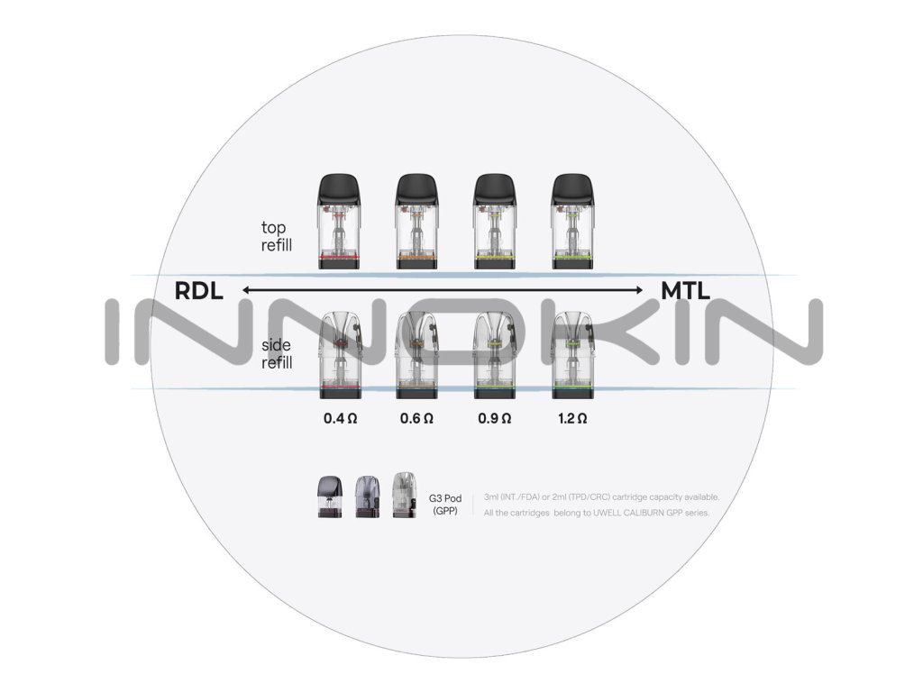 Cartridge Uwell Caliburn GPP, jež na vás čekají v tomto balení, přichází s novou metodou plnění. Boční silikonová záslepka se přemístila do horní části, pro úspěšné naplnění tak nebudete potřebovat cartridge odpojovat od těla baterie. Do plné kapacity 3ml ji snadno doplníte přímo na své e-cigaretě. Díky tomu se zkracuje doba plnění a zároveň si e-cigaretu můžete kdykoliv pohodlně doplnit jak na cestách, tak také v pohodlí domova.
