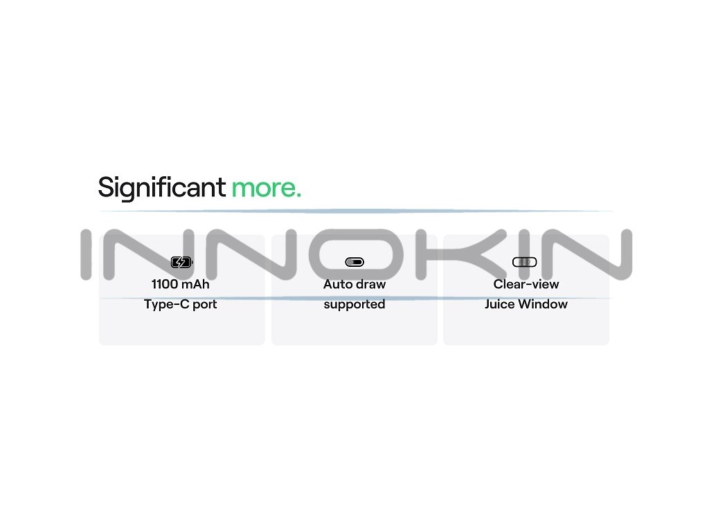 USB-C nabíjení a výkonná baterieModerní USB-C port s parametry 5V/1A umožňuje rychlé a bezpečné nabíjení baterie. Proces nabíjení je signalizován LED indikací pro snadné sledování stavu. Integrovaná Li-ion baterie s kapacitou 1100mAh poskytuje výdrž na celý den intenzivního vapování. |