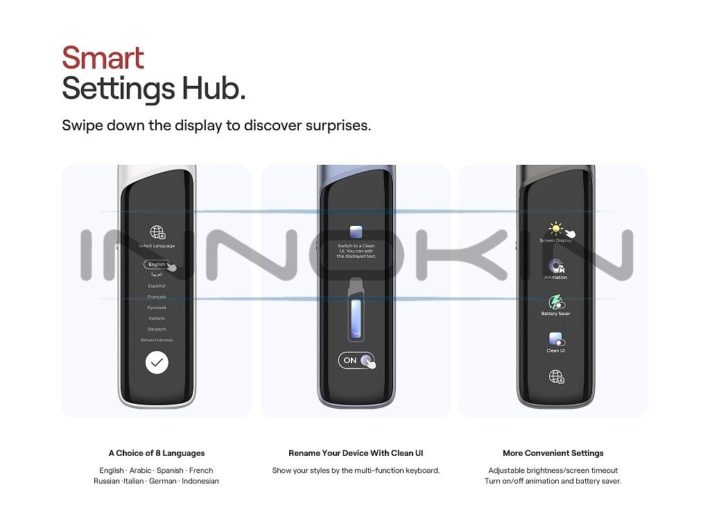 Barevný displejZakulacený HD displej s celobarevným profilem poskytuje přehledné zobrazení všech důležitých informací včetně výkonu, stavu baterie, odporu a nastaveného režimu. Tři různá schémata uživatelského rozhraní umožňují personalizaci podle vašich preferencí. Praktický denní a noční režim s regulací jasu chrání zrak při večerním vapování. |