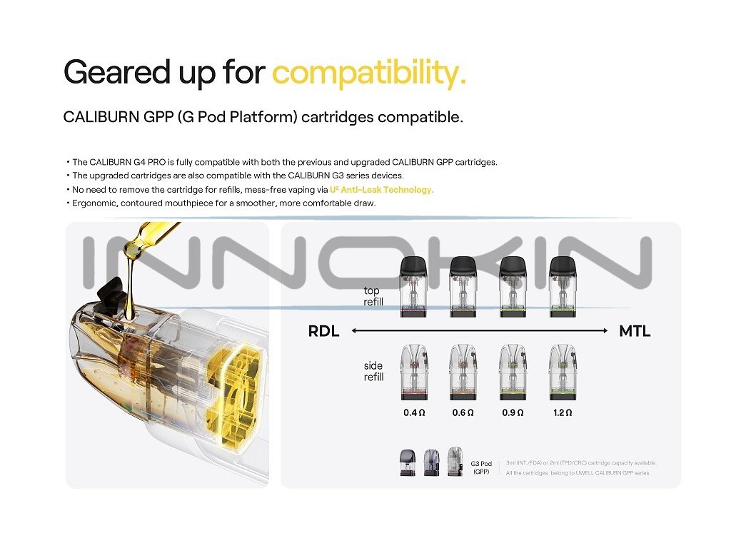 Cartridge GPPNové cartridge Caliburn GPP s objemem 3 ml nabízejí snadné plnění ze spodní strany a průhledný materiál PCTG pro kontrolu hladiny e-liquidu. Magnetické uchycení zajišťuje pevné spojení s tělem a jednoduchou výměnu. Cartridge je možné nasadit dvěma směry, přičemž každá orientace nabízí odlišnou šířku sacího otvoru pro jemnější ladění airflow podle vašich preferencí. |