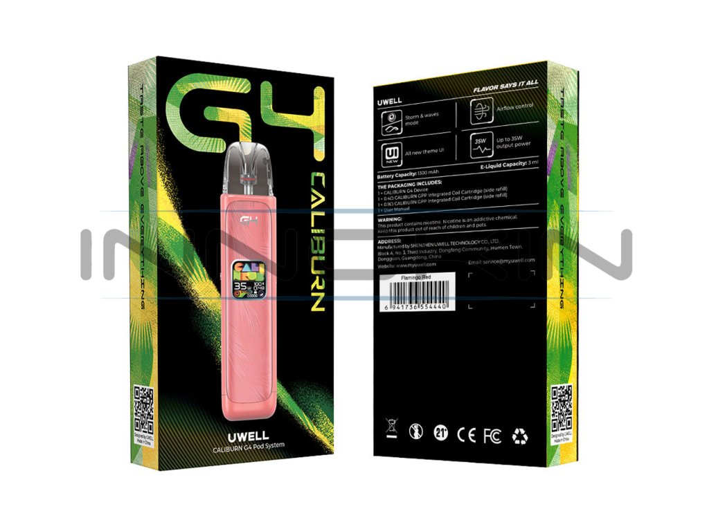 Uwell Caliburn G4 Pod Kit je dalším vymazleným Caliburnem s luxusním designovým zpracováním, kvalitní konstrukcí kombinující hliník a ABS a perfektní ergonomií. Konstrukci potom dominuje zakulacený displej na předním panelu a tradiční průzor na stav e-liquidu v horní části. Krásné barevné varianty produktu jsou navíc zárukou, že si model může užívat každý vaper a že si vybere zkrátka každý.