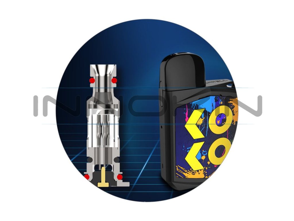 Aktuální stav baterie můžete sledovat přímo na zařízení pomocí barevné LED diody ve spodní části. Model Caliburn KOKO PRIME nabídne funkci automatického spínání potahu. Jednoduše tak přiložíte ústa k náustku a potáhnete. Cartridge můžete na baterii nasadit jedním ze dvou směrů. Každý směr dodá rozdílné množství vzduchu, KOKO PRIME tedy disponuje hned dvojím systémem airflow. Pro ovládání nebudete potřebovat žádné tlačítko. Ve vrchní části najdete cartridge s objemem 2 ml a použitím na žhavící tělíska. V balení najdete tělísko Uwell FeCrAl s odporem 1,0 ohm. Uwell Caliburn KOKO PRIME Pod Kit je ideální volbou pro uživatele, kteří hledají jednoduché MTL zařízení.