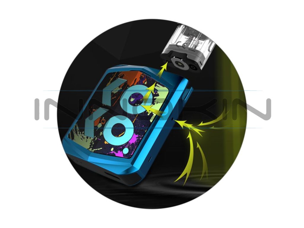 Novinkou je přítomnost vyměnitelných bočních panelů, které jsou k tělu přichyceny pomocí magnetů. Náhradní panely jsou v prodeji samostatně, můžete si sami zvolit, jaká barva panelů vám bude ladit nejvíce a přizpůsobit si tak vzhled e-cigarety přesně svým představám. Jedná se o příjemný doplněk už tak vyladěné e-cigarety.