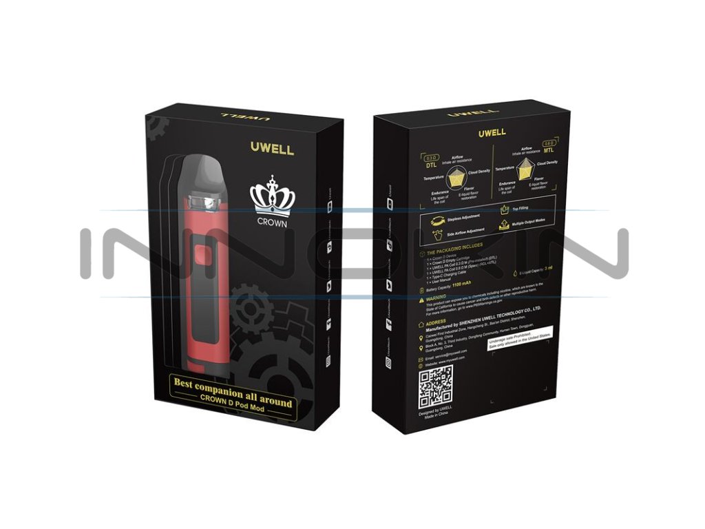 Uwell Crown D Pod Kit je elegantní a stylová elektronická cigareta s nabušenou výbavou, která je k dostání v celé řadě barevných variací. Celé tělo je potom vyrobeno z lehoučké hliníkové slitiny, přičemž hmotnost celé konstrukce se zastavila na krásných 59 g. Rozměry těla potom činí 106 x 28 x 18,5 mm, díky praktickému designu ji snadno uložíte do kapsy a příjemně se drží také v dlani během vapování.